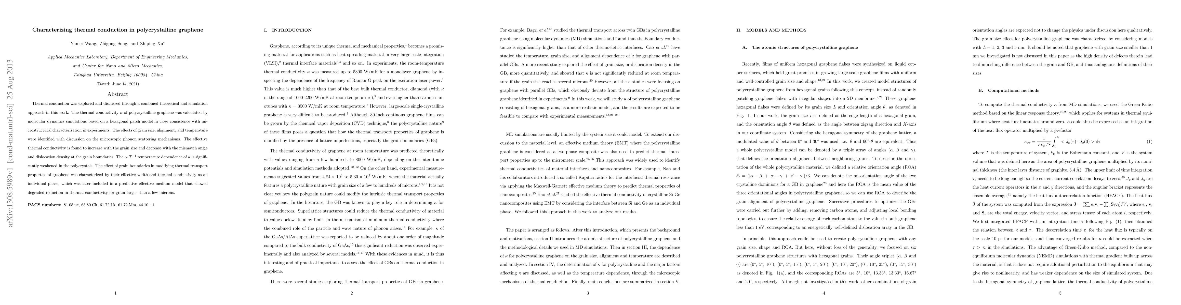 This study combines theoretical and simulation methods to characterize thermal conduction in polycrystalline graphene, revealing that thermal conductivity increases with grain size and decreases with grain boundary mismatch and dislocation density. The effective thermal conductivity is less dependent on temperature in polycrystalline forms, and a predictive model shows reduced thermal conductivity degradation for larger grains.