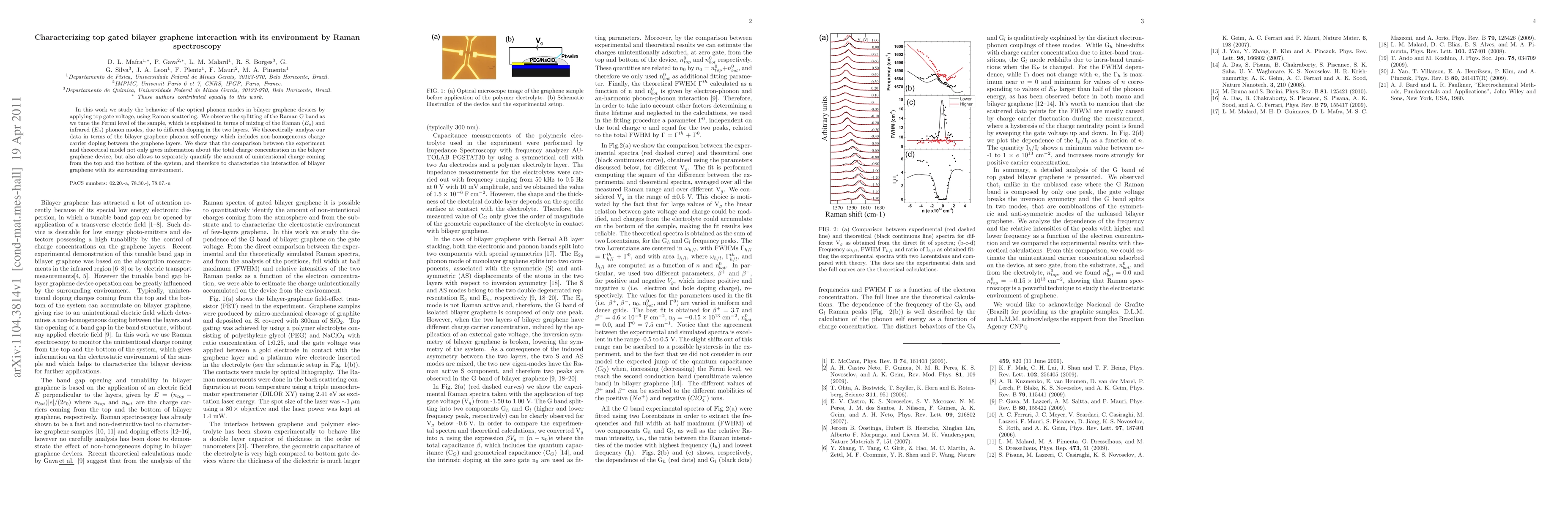 This study uses Raman spectroscopy to investigate the optical phonon modes in bilayer graphene under top gate voltage, observing Raman G band splitting due to varying Fermi levels. Theoretical analysis reveals insights into charge carrier doping differences and the interaction between bilayer graphene and its environment.