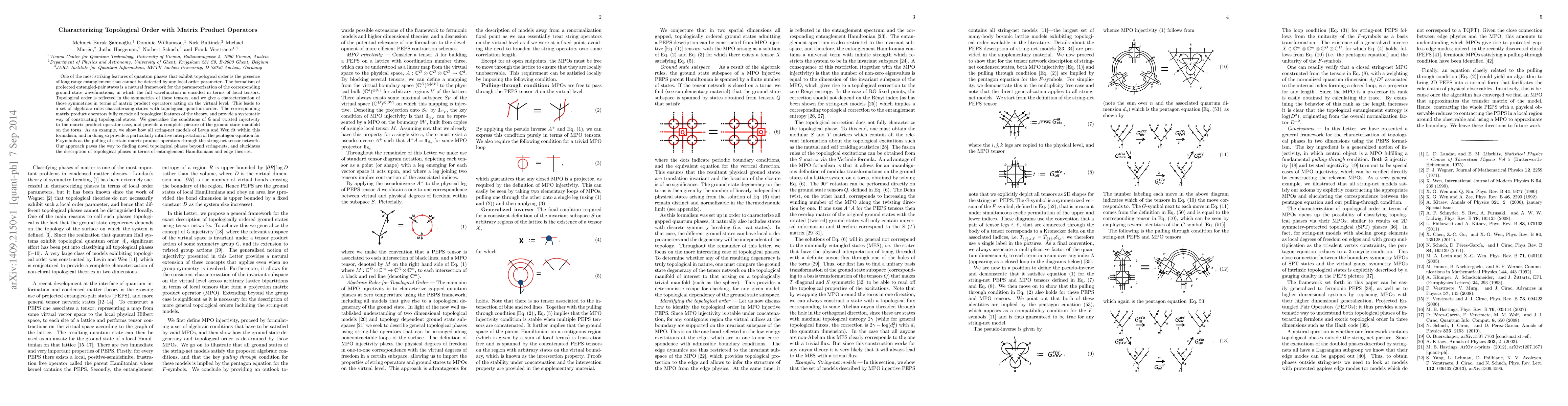 This paper characterizes topological order in quantum phases using matrix product operators and their symmetries, providing a systematic framework for constructing topological states and elucidating string-net models. It also generalizes conditions for topological order and offers a new perspective on entanglement Hamiltonians and edge theories.