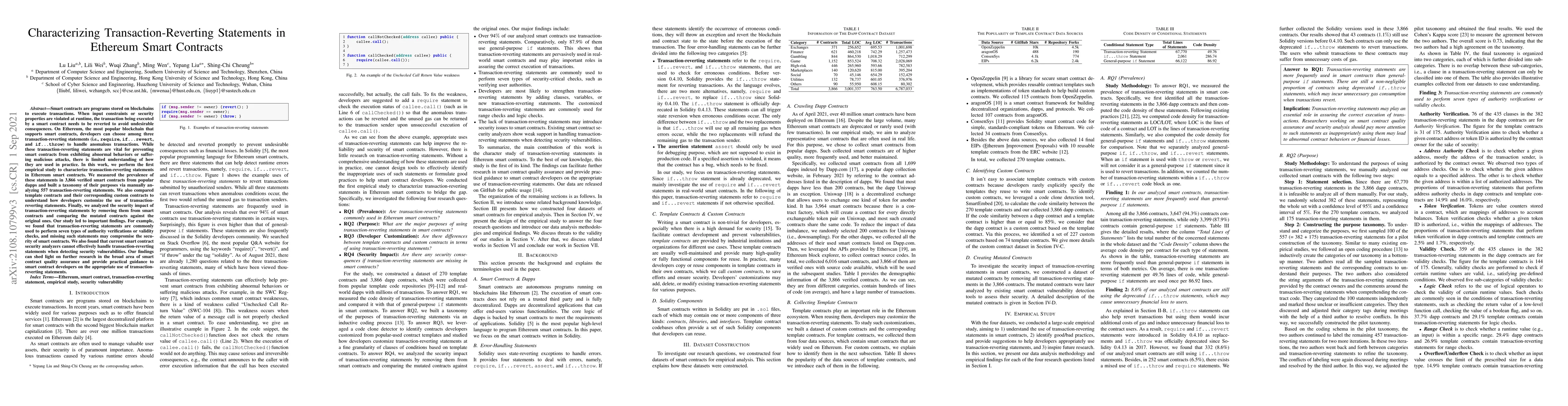 This paper conducts an empirical study to characterize the use of transaction-reverting statements in Ethereum smart contracts, revealing their prevalence and purposes through analysis of 3,866 verified contracts and a taxonomy of 557 statements. It also investigates the security impact of these statements by comparing original and mutated contracts.