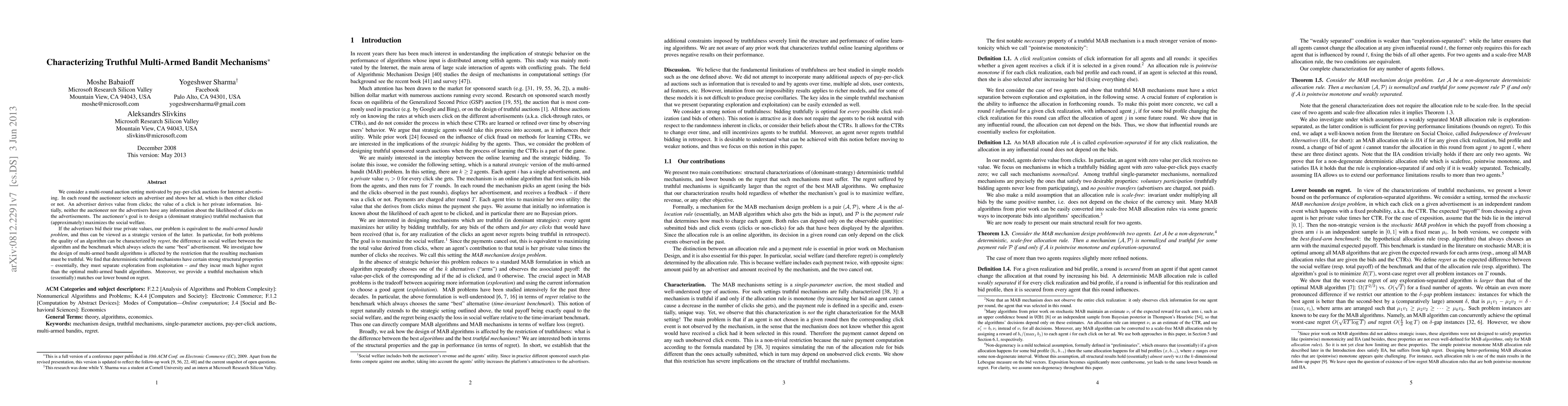 We consider a multi-round auction setting motivated by pay-per-click auctions for Internet advertising. In each round the auctioneer selects an advertiser and shows her ad, which is then either clicked or not. An advertiser derives value from clicks; the value of a click is her private information. Initially, neither the auctioneer nor the advertisers have any information about the likelihood of clicks on the advertisements. The auctioneer's goal is to design a (dominant strategies) truthful mechanism that (approximately) maximizes the social welfare. If the advertisers bid their true private values, our problem is equivalent to the "multi-armed bandit problem", and thus can be viewed as a strategic version of the latter. In particular, for both problems the quality of an algorithm can be characterized by "regret", the difference in social welfare between the algorithm and the benchmark which always selects the same "best" advertisement. We investigate how the design of multi-armed bandit algorithms is affected by the restriction that the resulting mechanism must be truthful. We find that truthful mechanisms have certain strong structural properties -- essentially, they must separate exploration from exploitation -- and they incur much higher regret than the optimal multi-armed bandit algorithms. Moreover, we provide a truthful mechanism which (essentially) matches our lower bound on regret.