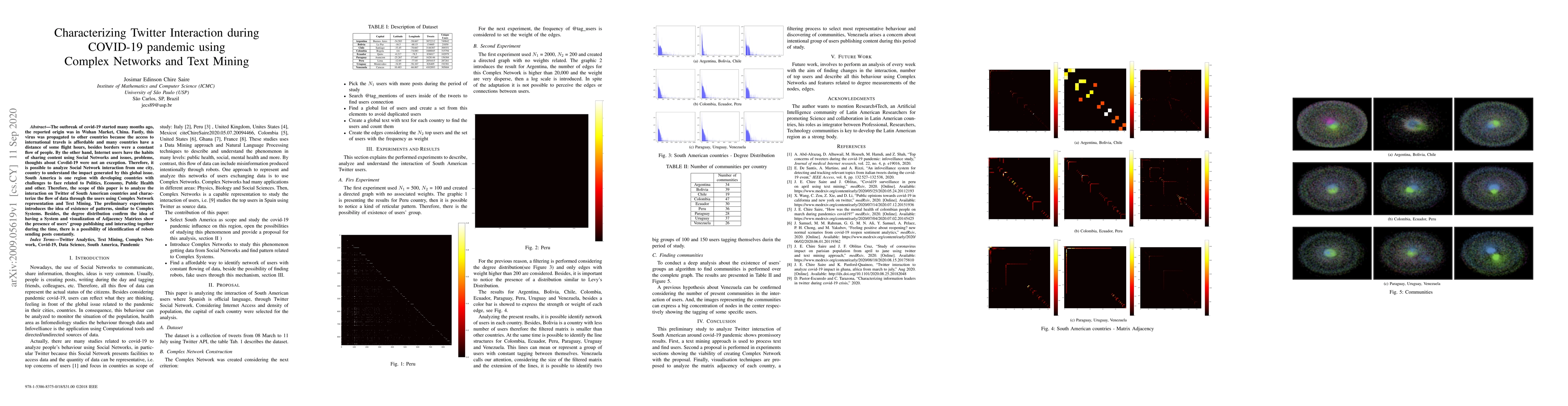 The outbreak of covid-19 started many months ago, the reported origin was in Wuhan Market, China. Fastly, this virus was propagated to other countries because the access to international travels is affordable and many countries have a distance of some flight hours, besides borders were a constant flow of people. By the other hand, Internet users have the habits of sharing content using Social Networks and issues, problems, thoughts about Covdid-19 were not an exception. Therefore, it is possible to analyze Social Network interaction from one city, country to understand the impact generated by this global issue. South America is one region with developing countries with challenges to face related to Politics, Economy, Public Health and other. Therefore, the scope of this paper is to analyze the interaction on Twitter of South American countries and characterize the flow of data through the users using Complex Network representation and Text Mining. The preliminary experiments introduces the idea of existence of patterns, similar to Complex Systems. Besides, the degree distribution confirm the idea of having a System and visualization of Adjacency Matrices show the presence of users' group publishing and interacting together during the time, there is a possibility of identification of robots sending posts constantly.
