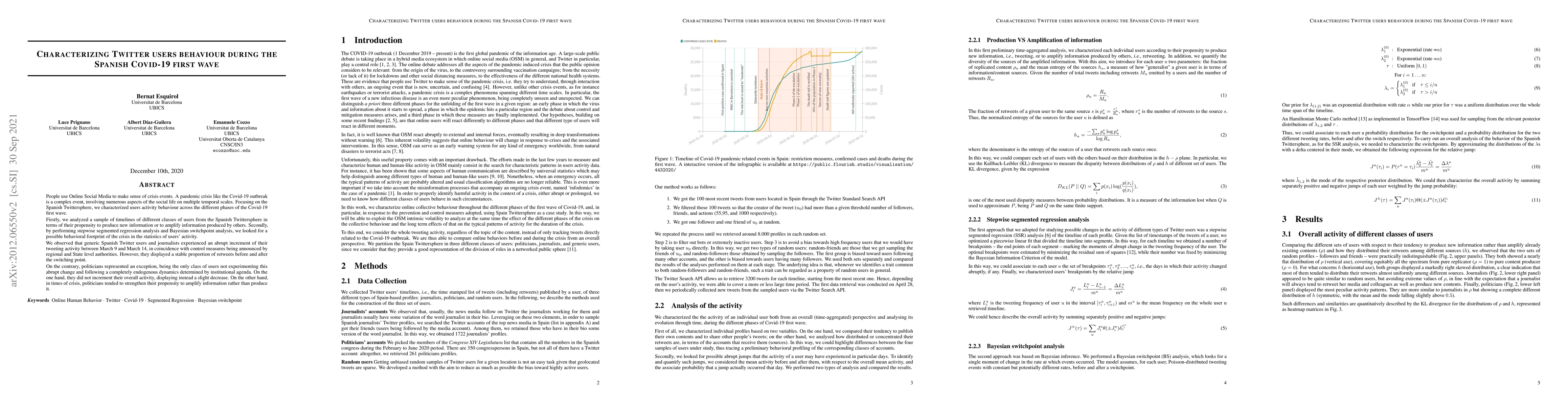 People use Online Social Media to make sense of crisis events. A pandemic crisis like the Covid-19 outbreak is a complex event, involving numerous aspects of the social life on multiple temporal scales. Focusing on the Spanish Twittersphere, we characterized users activity behaviour across the different phases of the Covid-19 first wave. Firstly, we analyzed a sample of timelines of different classes of users from the Spanish Twittersphere in terms of their propensity to produce new information or to amplify information produced by others. Secondly, by performing stepwise segmented regression analysis and Bayesian switchpoint analysis, we looked for a possible behavioral footprint of the crisis in the statistics of users' activity. We observed that generic Spanish Twitter users and journalists experienced an abrupt increment of their tweeting activity between March 9 and March 14, in coincidence with control measures being announced by regional and State level authorities. However, they displayed a stable proportion of retweets before and after the switching point. On the contrary, politicians represented an exception, being the only class of users not experimenting this abrupt change and following a completely endogenous dynamics determined by institutional agenda. On the one hand, they did not increment their overall activity, displaying instead a slight decrease. On the other hand, in times of crisis, politicians tended to strengthen their propensity to amplify information rather than produce it.