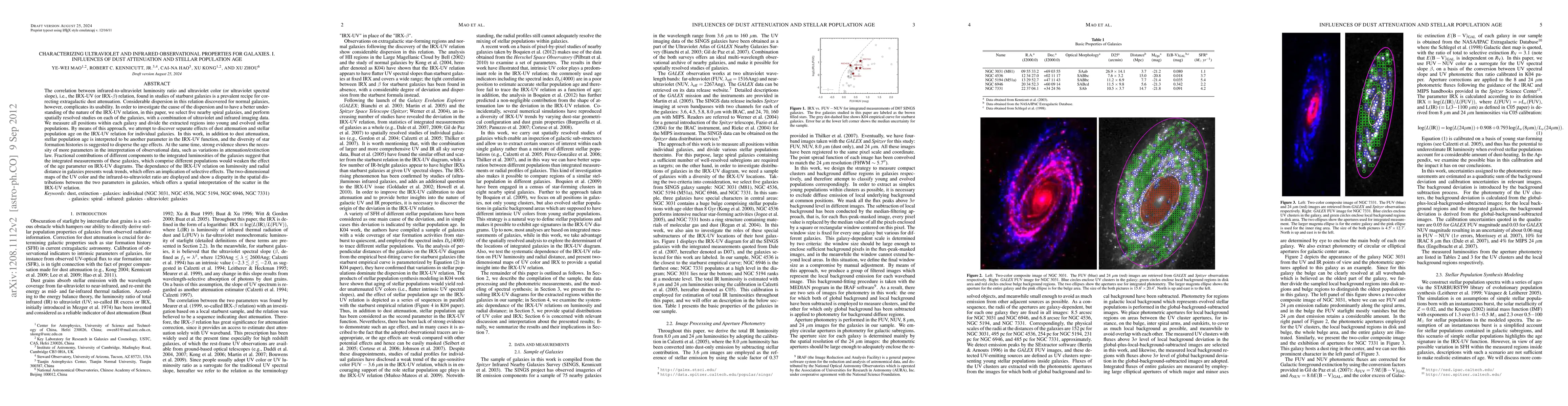 This paper investigates the IRX-UV relation in five nearby spiral galaxies to determine the influence of dust attenuation and stellar population age on this correlation. The study reveals that stellar population age, along with dust, significantly affects the IRX-UV relation, suggesting that diverse star formation histories contribute to the observed dispersion.