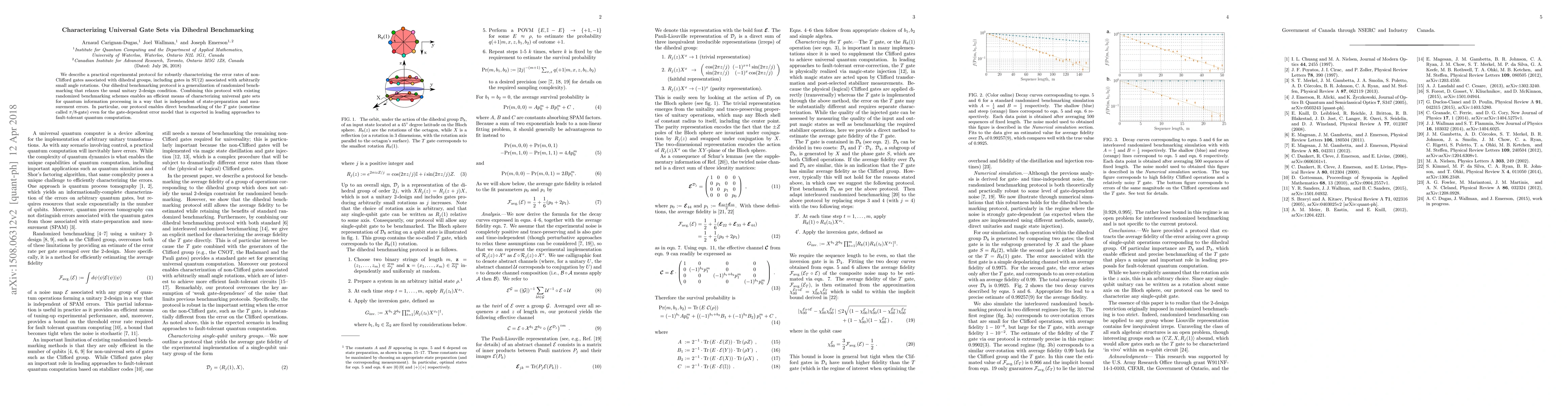 We describe a practical experimental protocol for robustly characterizing the error rates of non-Clifford gates associated with dihedral groups, including gates in SU(2) associated with arbitrarily small angle rotations. Our dihedral benchmarking protocol is a generalization of randomized benchmarking that relaxes the usual unitary 2-design condition. Combining this protocol with existing randomized benchmarking schemes enables an efficient means of characterizing universal gate sets for quantum information processing in a way that is independent of state-preparation and measurement errors. In particular, our protocol enables direct benchmarking of the $T$ gate (sometime called $\pi/8$-gate) even for the gate-dependent error model that is expected in leading approaches to fault-tolerant quantum computation.