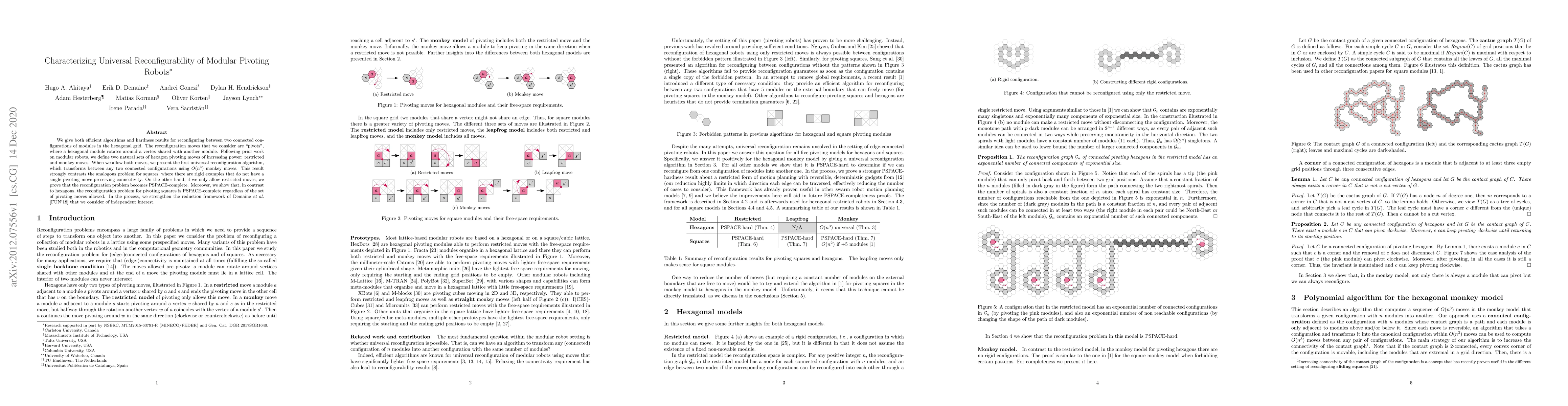 This paper presents algorithms and complexity results for reconfiguring modular pivoting robots on hexagonal grids, showing universal reconfiguration with $O(n^3)$ moves when both restricted and monkey moves are allowed. It contrasts this with the PSPACE-complete reconfiguration problem for square modules, regardless of the allowed moves.