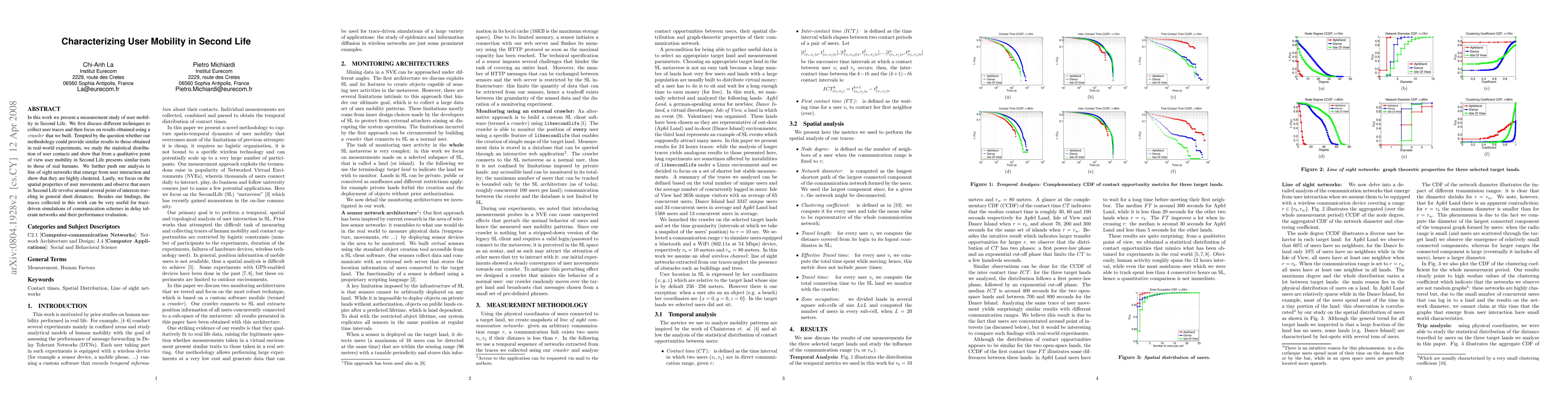 Researchers studied user mobility in Second Life, finding that users' movements resemble those of real humans, with clusters forming around point of interests and short distances traveled.