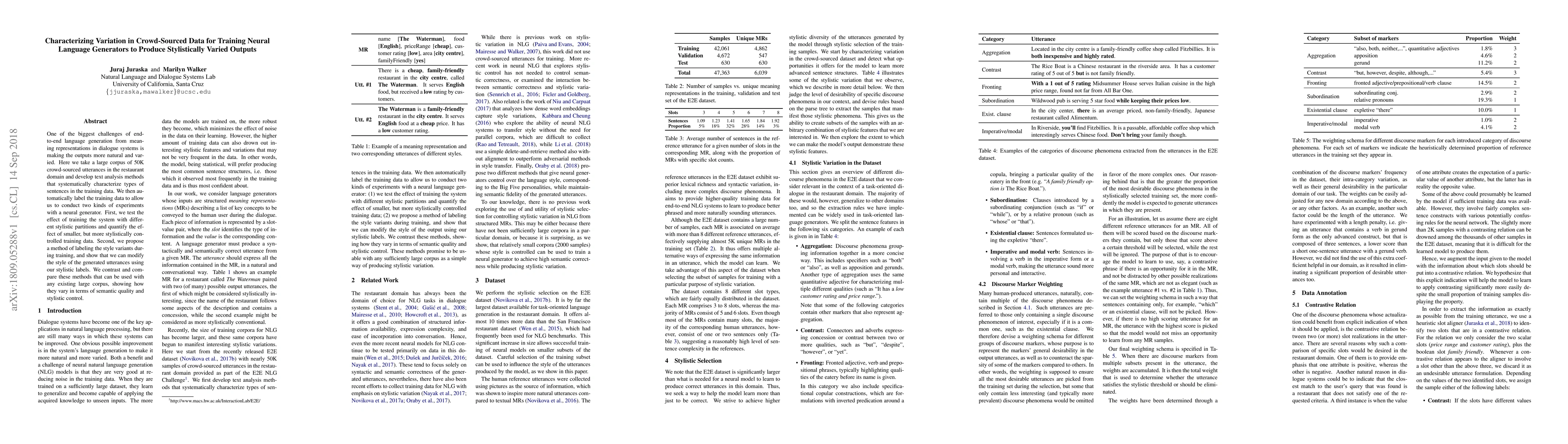This paper explores methods to enhance the naturalness and stylistic variety of neural language generators using crowd-sourced data. It characterizes and labels a large corpus of restaurant-related utterances to train a system that can produce stylistically varied outputs, demonstrating improved control over generated text style.