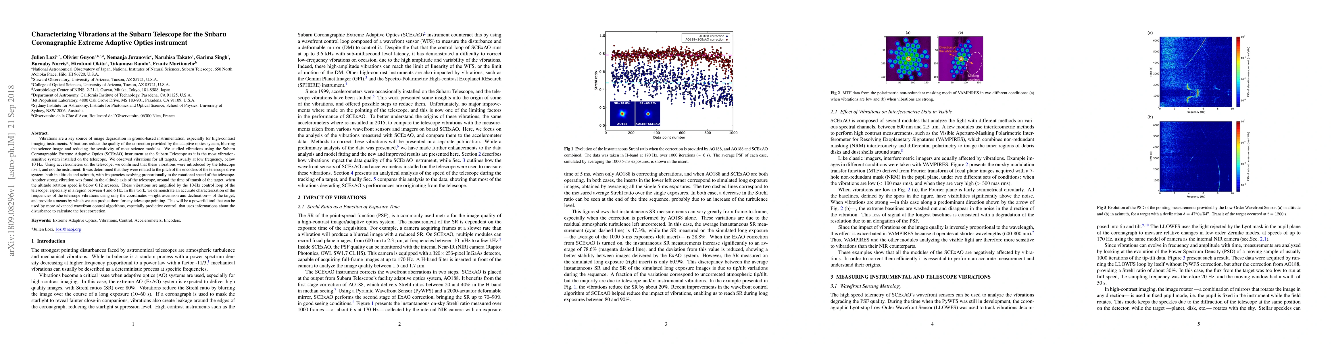 This study characterizes vibrations affecting the Subaru Telescope's SCExAO instrument, identifying low-frequency vibrations below 10 Hz originating from the telescope's drive system. The research provides a method to predict these vibrations based on target coordinates, enhancing adaptive optics correction strategies.