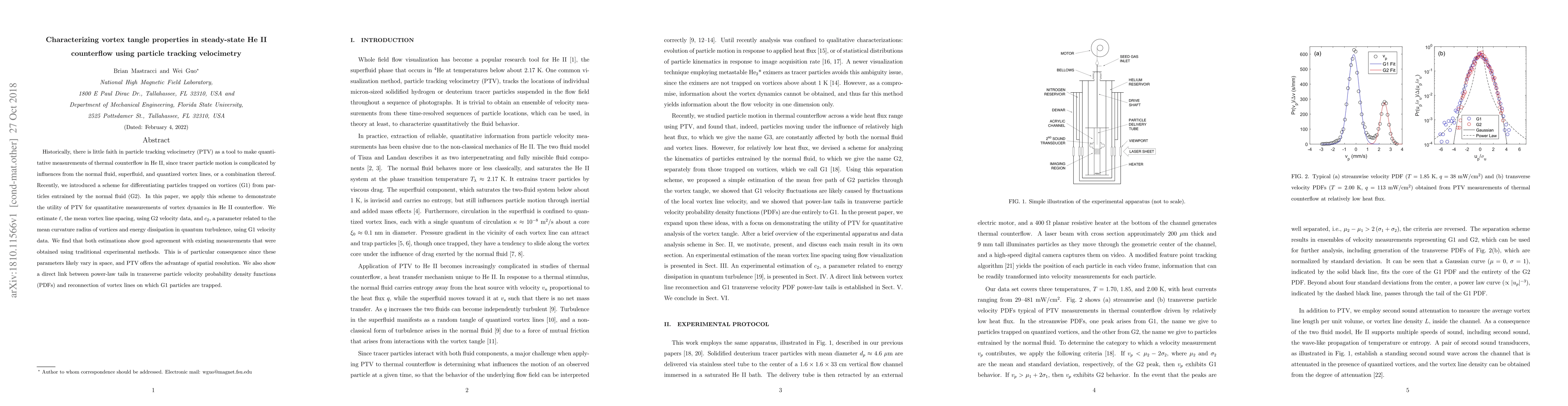 This paper demonstrates the effectiveness of particle tracking velocimetry for quantifying vortex dynamics in steady-state He II counterflow, estimating mean vortex line spacing and mean curvature radius parameters, and showing agreement with traditional methods. It also links power-law tails in particle velocity distributions to vortex line reconnection events.