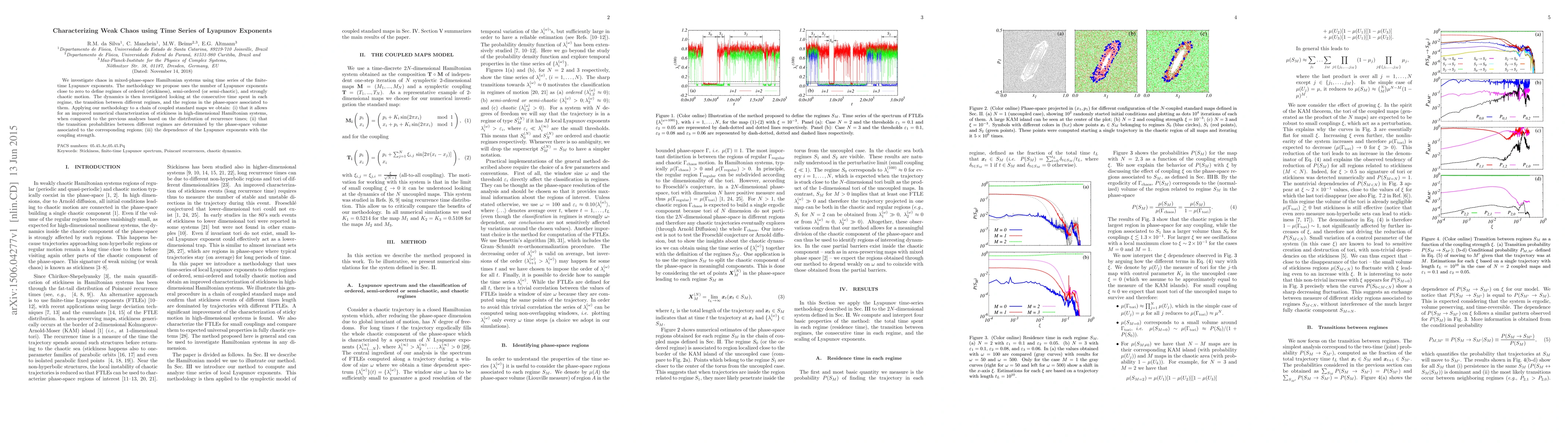 This paper develops a new method to characterize weak chaos in Hamiltonian systems by analyzing time series of finite-time Lyapunov exponents, identifying regimes of ordered, semi-ordered, and chaotic motion based on the number of near-zero exponents. It demonstrates the method's effectiveness on coupled standard maps, showing improved detection of stickiness and revealing how phase-space volumes influence transition probabilities between regimes.