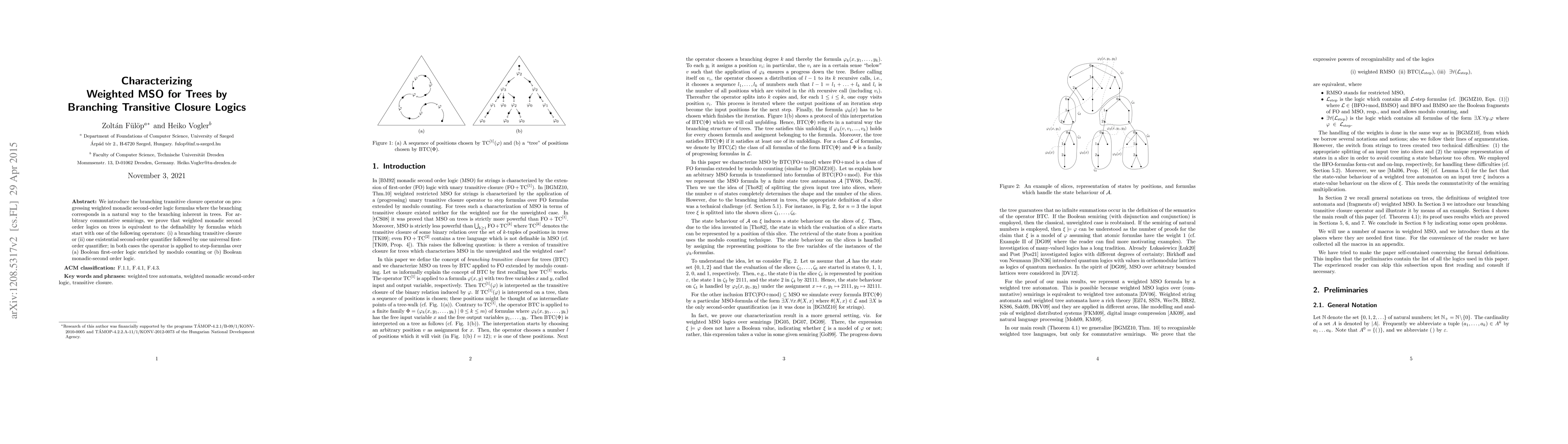 This paper introduces a branching transitive closure operator for weighted monadic second-order logic on trees. It proves equivalence between weighted monadic second-order logic and formulas starting with either a branching transitive closure or an existential second-order quantifier followed by a universal first-order quantifier over enriched Boolean logics.