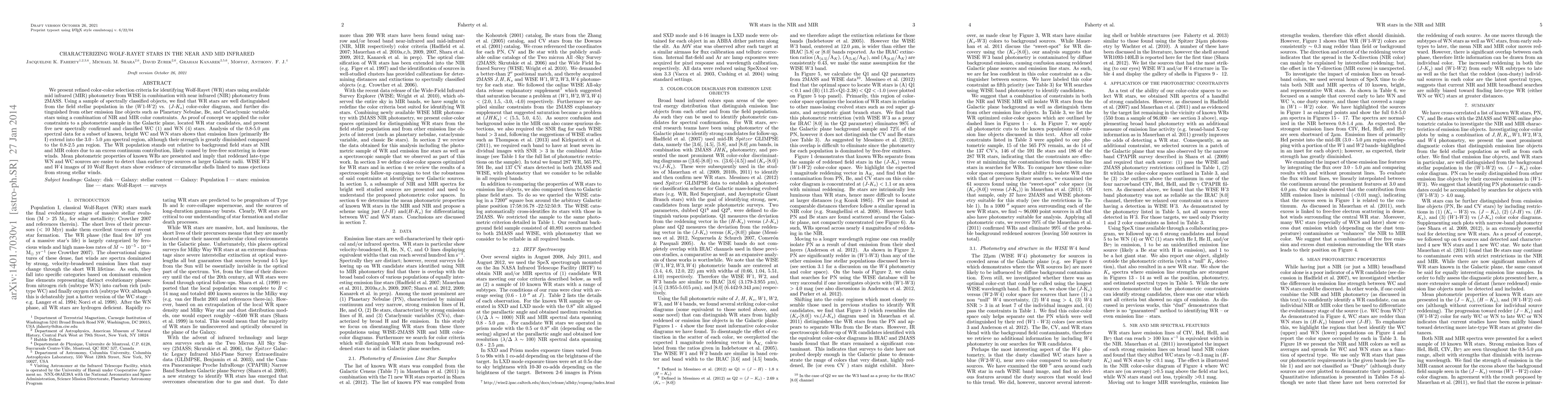 This paper refines color-color selection criteria for identifying Wolf-Rayet stars using NIR and MIR photometry, distinguishing them from other emission line objects in the Galactic plane. The study confirms five new WR stars and finds that WR stars exhibit excess continuum contribution due to free-free scattering in dense winds.