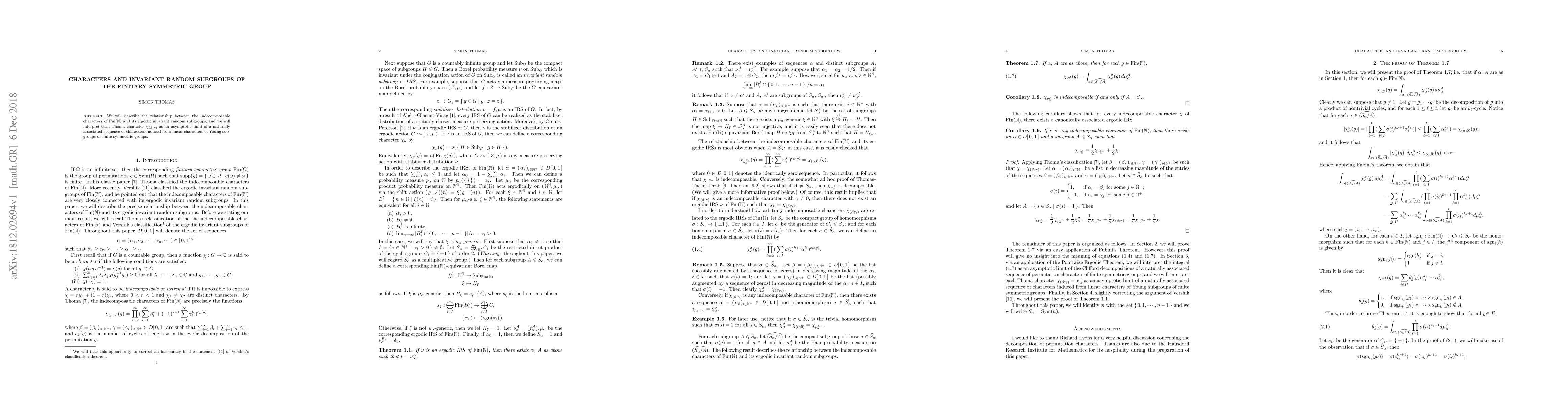 We will describe the relationship between the indecomposable characters of the finitary symmetric group and its ergodic invariant random subgroups; and we will interpret each Thoma character as an asymptotic limit of a naturally associated sequence of characters induced from linear characters of Young subgroups of finite symmetric groups.