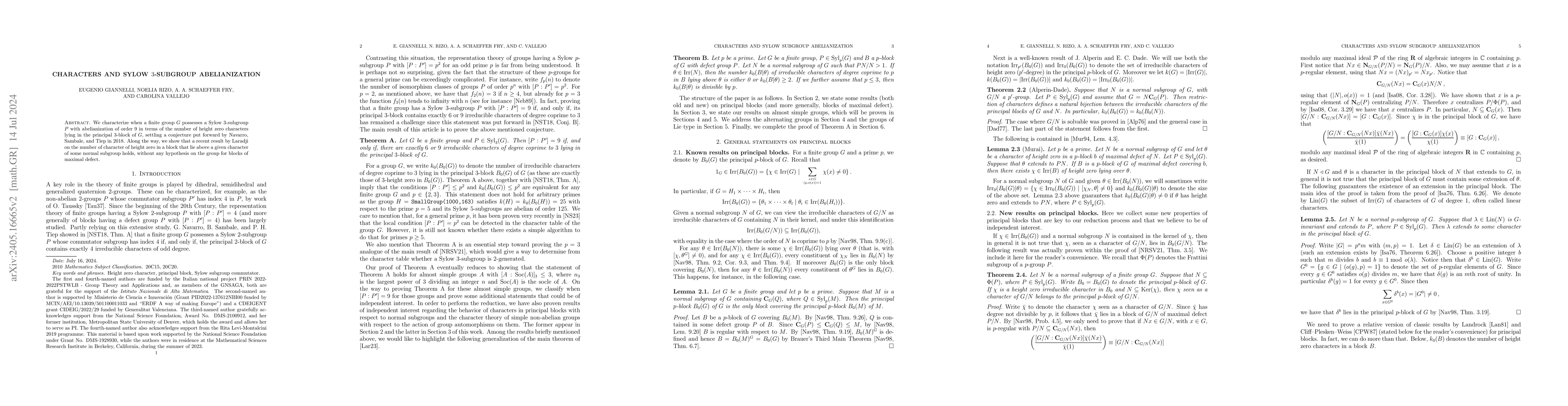 This paper characterizes conditions under which a finite group G has a Sylow 3-subgroup P with an abelianization of order 9, using the number of height zero characters in G's principal 3-block, and confirms a conjecture by Navarro, Sambale, and Tiep from 2018. It also verifies Laradji's result on character counts in blocks of maximal defect without additional group assumptions.
