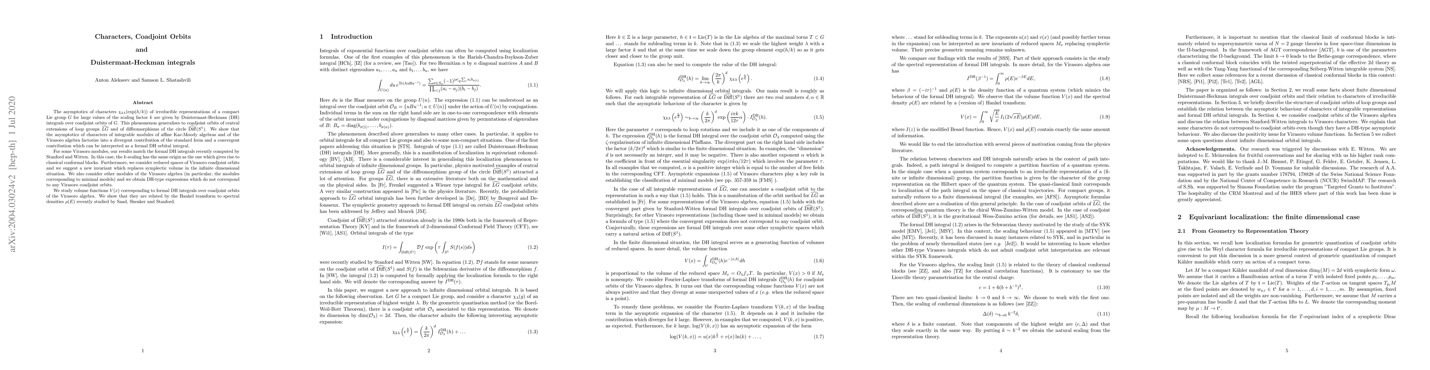 This paper explores the asymptotic behavior of characters in irreducible representations of compact Lie groups and their central extensions, showing that it corresponds to Duistermaat-Heckman integrals over coadjoint orbits. It also applies these findings to Virasoro algebra modules, identifying a new invariant in infinite dimensions and establishing a connection between formal DH integrals and spectral densities.