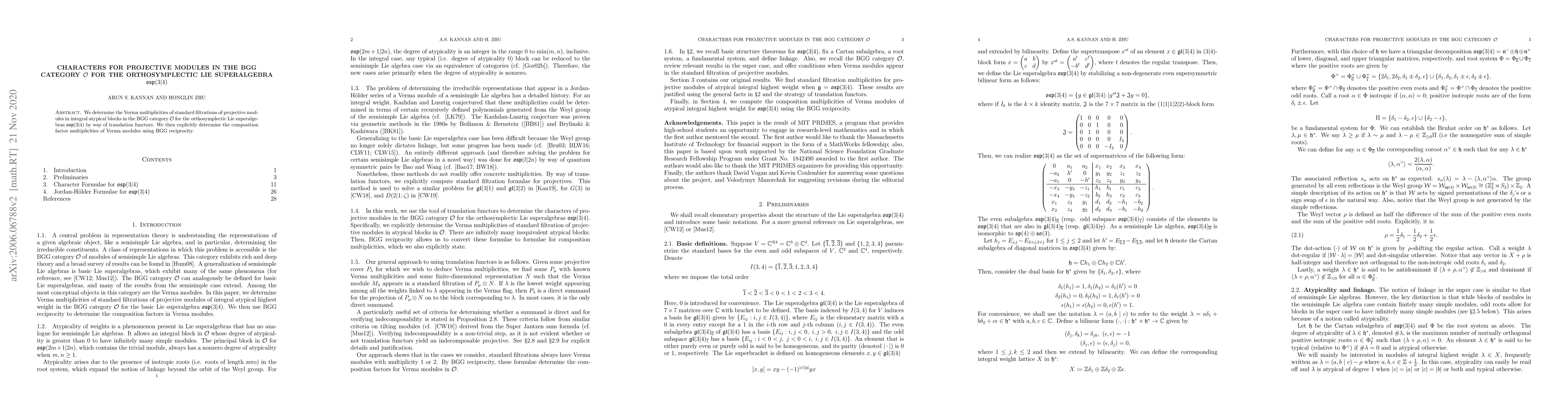 Summary: This paper calculates the Verma multiplicities and composition factor multiplicities of projective modules in the BGG category $\mathcal{O}$ for $\mathfrak{osp}(3|4)$ using translation functors and BGG reciprocity.
