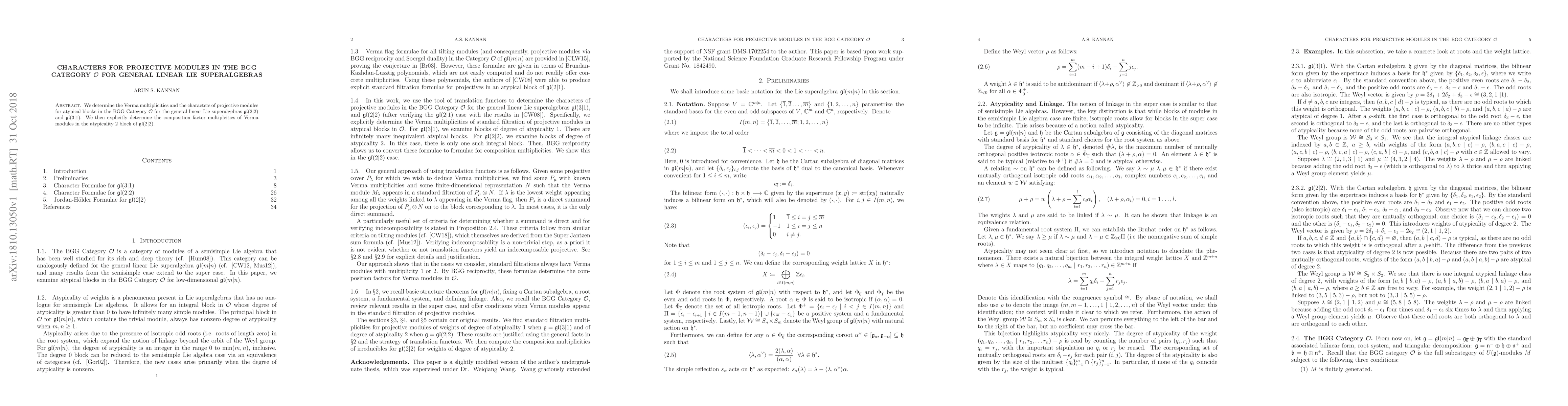 This paper determines the characters and Verma multiplicities of projective modules in the BGG Category O for the general linear Lie superalgebras $\frak{gl}(2|2)$ and $\frak{gl}(3|1)$, focusing on atypical blocks and explicitly analyzing the composition factor multiplicities in the atypicality 2 block of $\frak{gl}(2|2)$.