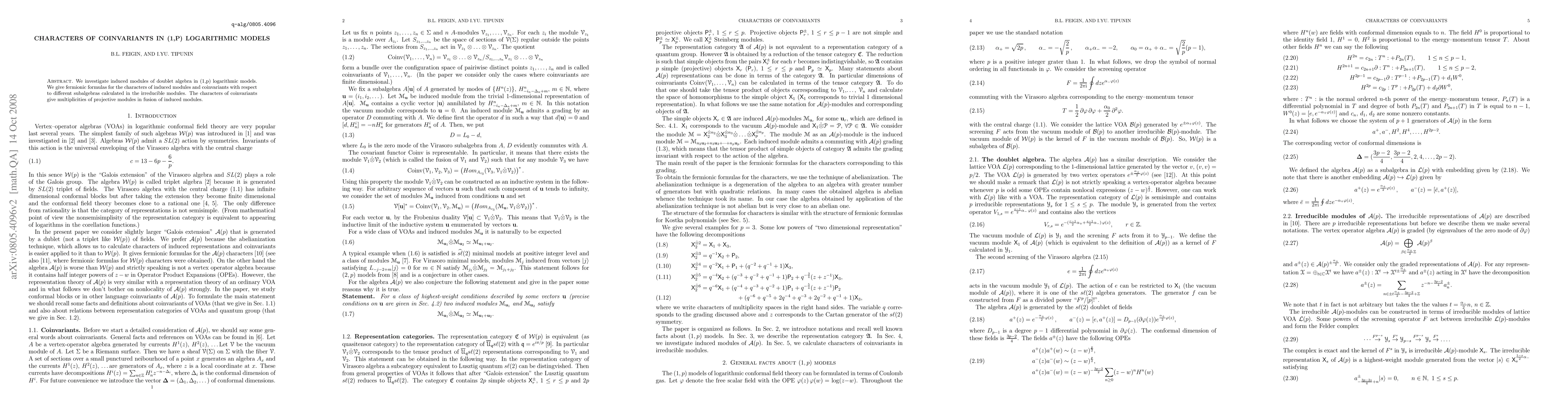 We investigate induced modules of doublet algebra in (1,p) logarithmic models. We give fermionic formulas for the characters of induced modules and coinvariants with respect to different subalgebras calculated in the irreducible modules. The characters of coinvariants give multiplicities of projective modules in fusion of induced modules.