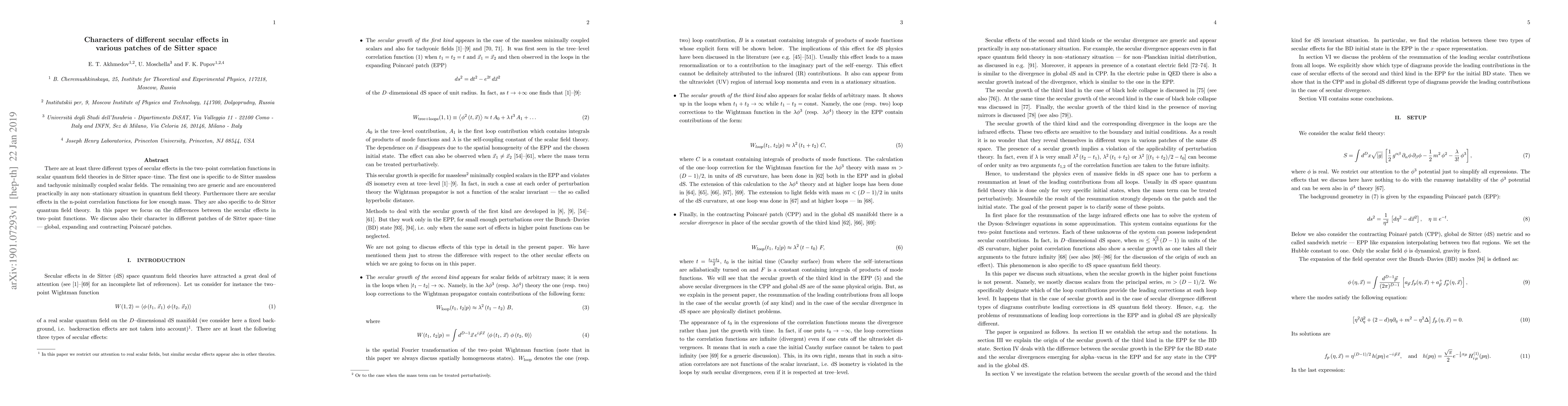 There are at least three different types of secular effects in the two-point correlation functions in scalar quantum field theories in de Sitter space-time. The first one is specific to de Sitter massless and tachyonic minimally coupled scalar fields. The remaining two are generic and are encountered practically in any non-stationary situation in quantum field theory. Furthermore there are secular effects in the n-point correlation functions for low enough mass. They are also specific to de Sitter quantum field theory. In this paper we focus on the differences between the secular effects in two-point functions. We discuss also their character in different patches of de Sitter space-time - global, expanding and contracting Poincar\'{e} patches.