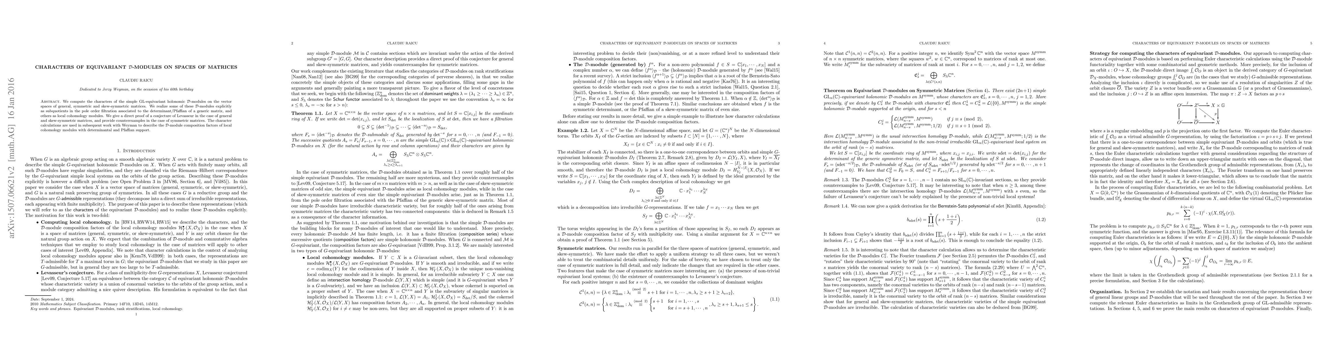 We compute the characters of the simple GL-equivariant holonomic D-modules on the vector spaces of general, symmetric and skew-symmetric matrices. We realize some of these D-modules explicitly as subquotients in the pole order filtration associated to the determinant/Pfaffian of a generic matrix, and others as local cohomology modules. We give a direct proof of a conjecture of Levasseur in the case of general and skew-symmetric matrices, and provide counterexamples in the case of symmetric matrices. The character calculations are used in subsequent work with Weyman to describe the D-module composition factors of local cohomology modules with determinantal and Pfaffian support.