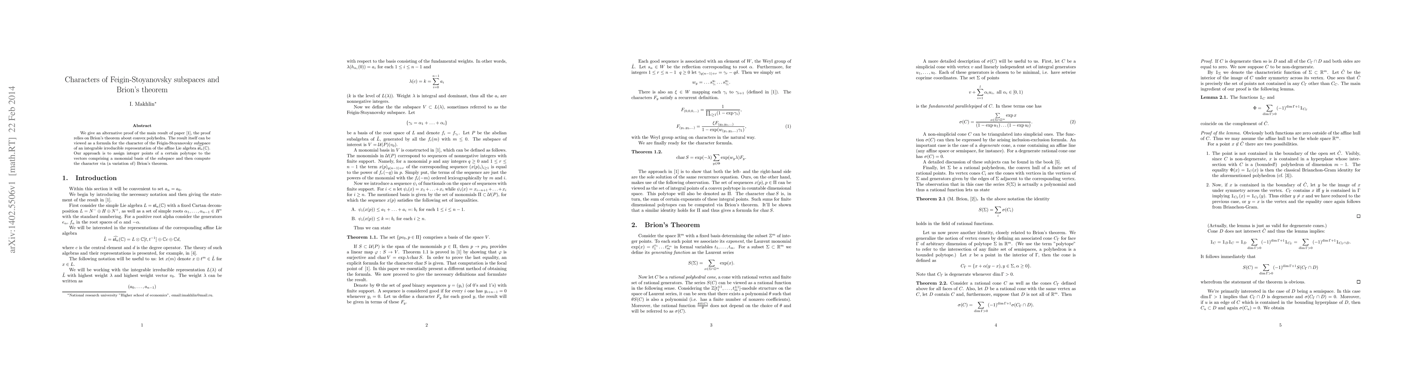 We give an alternative proof of the main result of the paper http://arxiv.org/abs/math/0112104, the proof relies on Brion's theorem about convex polyhedra. The result itself can be viewed as a formula for the character of the Feigin-Stoyanovsky subspace of an integrable irreducible representation of the affine Lie algebra $\widehat{\mathfrak{sl}_n}(\mathbb{C})$. Our approach is to assign integer points of a certain polytope to the vectors comprising a monomial basis of the subspace and then compute the character via (a variation of) Brion's theorem.