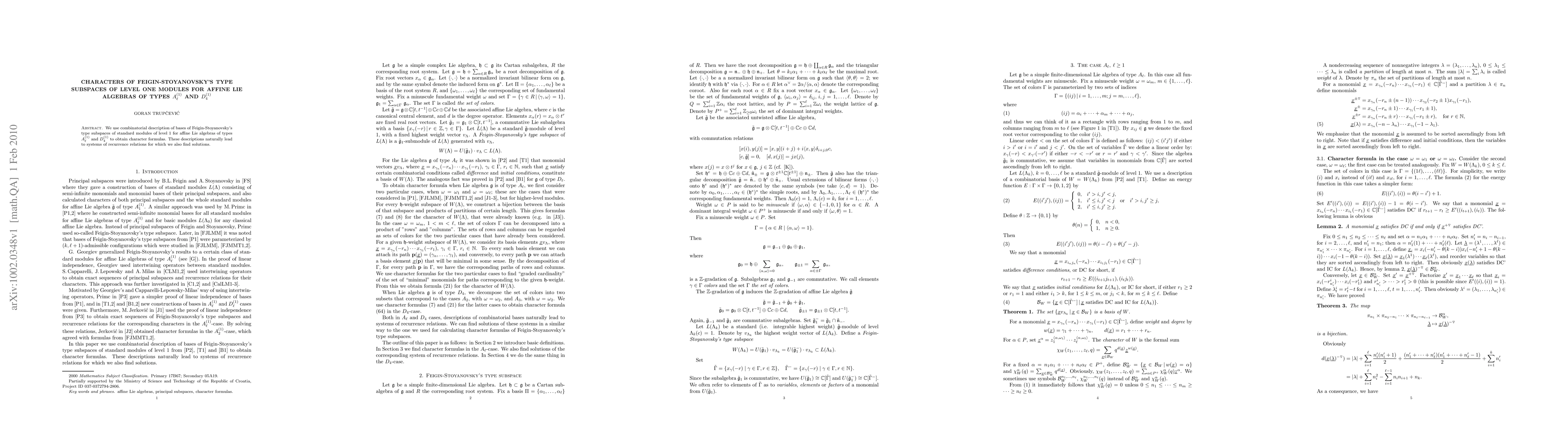 Summary: The paper derives character formulas for Feigin-Stoyanovsky's type subspaces of level one modules for affine Lie algebras of types $A_\ell^{(1)}$ and $D_4^{(1)}$ using combinatorial bases, and solves the resulting recurrence relations.