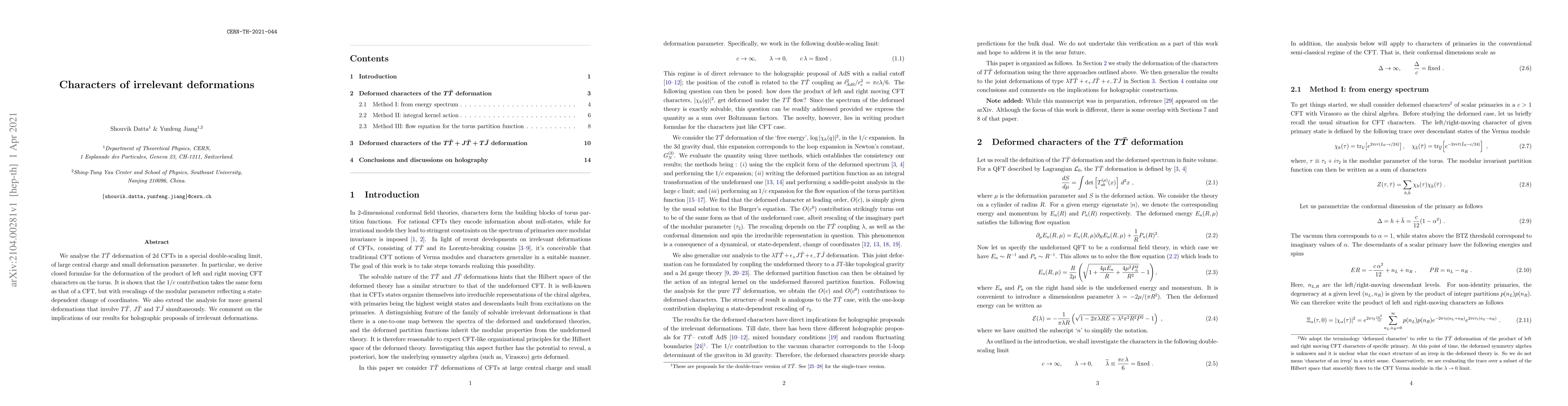 This paper derives closed formulae for the $T\bar{T}$ deformation of 2d CFT characters in a double-scaling limit, showing that the $1/c$ contribution mirrors CFT forms with rescaled modular parameters. The study extends to more general deformations involving $T\bar{T}$, $J\bar{T}$, and $T\bar{J}$, with implications for holographic proposals of irrelevant deformations.