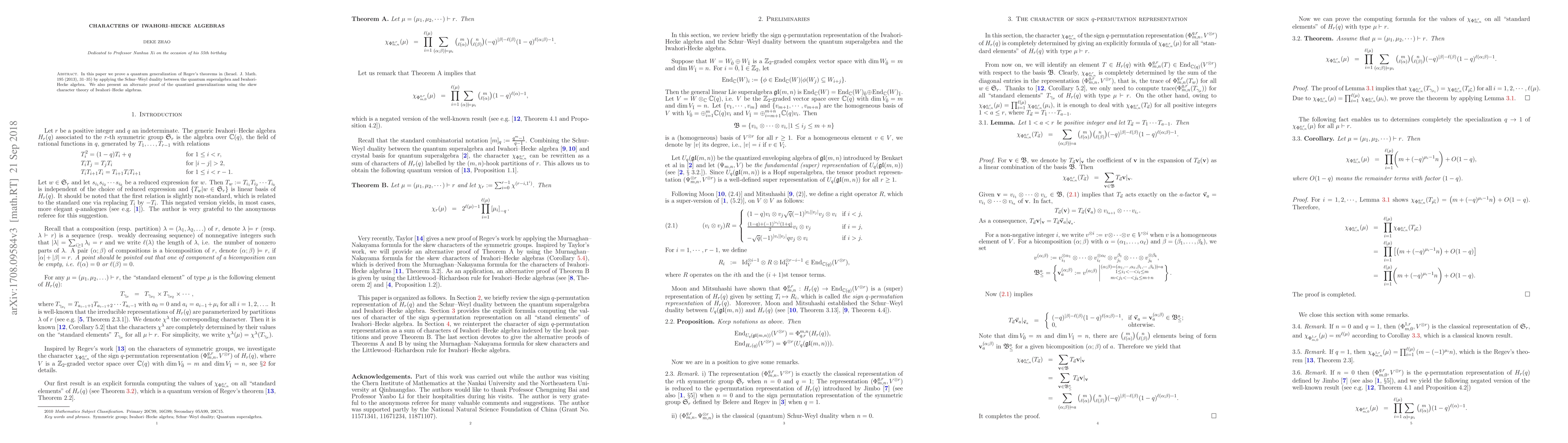 This paper presents a quantum generalization of Regev's theorems via Schur-Weyl duality between quantum superalgebras and Iwahori-Hecke algebras, and offers an alternative proof using skew character theory of Iwahori-Hecke algebras.