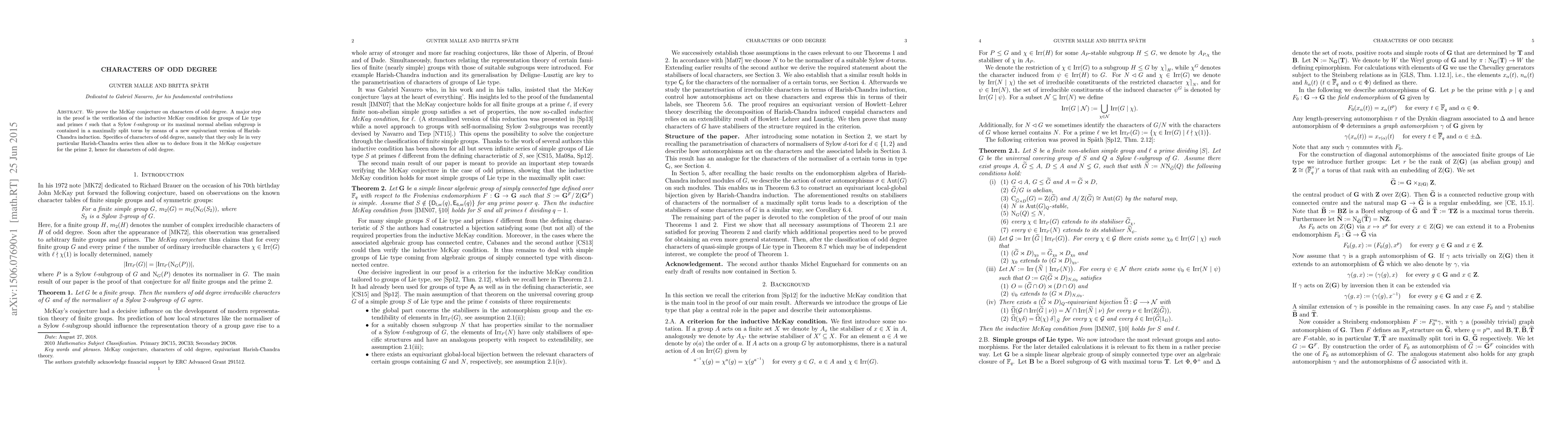 This paper proves the McKay conjecture for characters of odd degree by verifying the inductive McKay condition for groups of Lie type using a new equivariant version of Harish-Chandra induction. The specific properties of characters of odd degree allow the deduction of the conjecture for the prime 2.