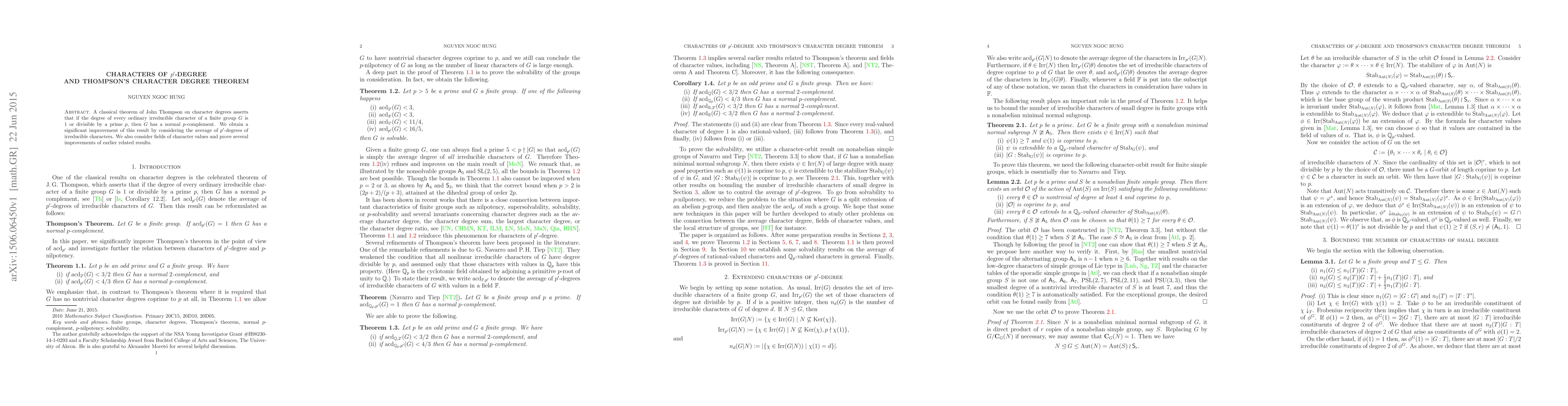 This paper improves John Thompson's character degree theorem by focusing on the average of $p'$-degrees of irreducible characters, showing that if these degrees are 1 or divisible by a prime $p$, then $G$ has a normal $p$-complement. It also advances related results concerning fields of character values.