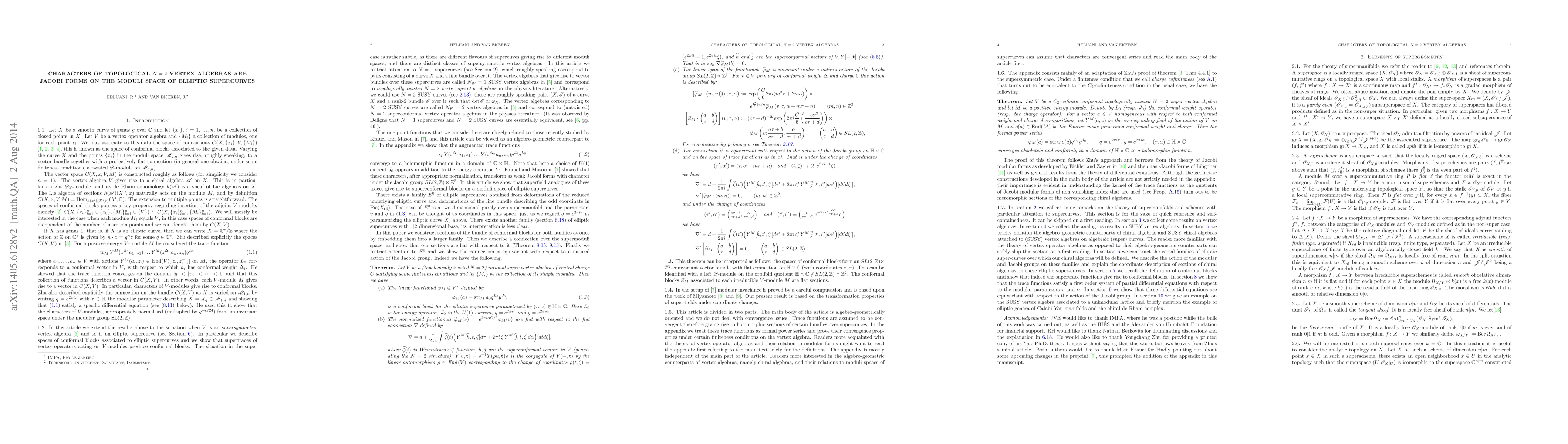 We show that trace functions on modules of topological N=2 super vertex algebras give rise to conformal blocks on elliptic supercurves. We show that they satisfy a system of linear partial differential equations with respect to the modular parameters of the supercurves. Under some finiteness condition on the vertex algebra these differential equations can be interpreted as a connection on the vector bundle of conformal blocks. We show that this connection is equivariant with respect to a natural action of the Jacobi modular group on the modular parameters and the trace functions. In the appendix we prove the convergence of the trace functions.