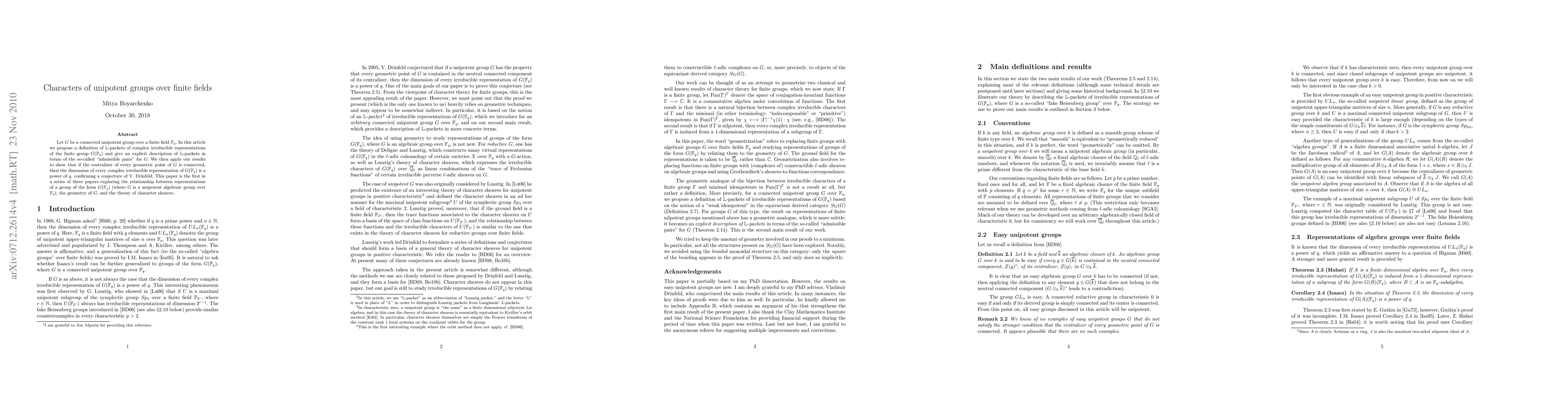 This paper defines L-packets for complex irreducible representations of the finite group G(F_q), where G is a connected unipotent group over a finite field F_q, and shows that under certain conditions, the dimensions of these representations are powers of q, confirming a conjecture by V. Drinfeld. This work initiates a series exploring the interplay between such representations, the group's geometry, and character sheaves.