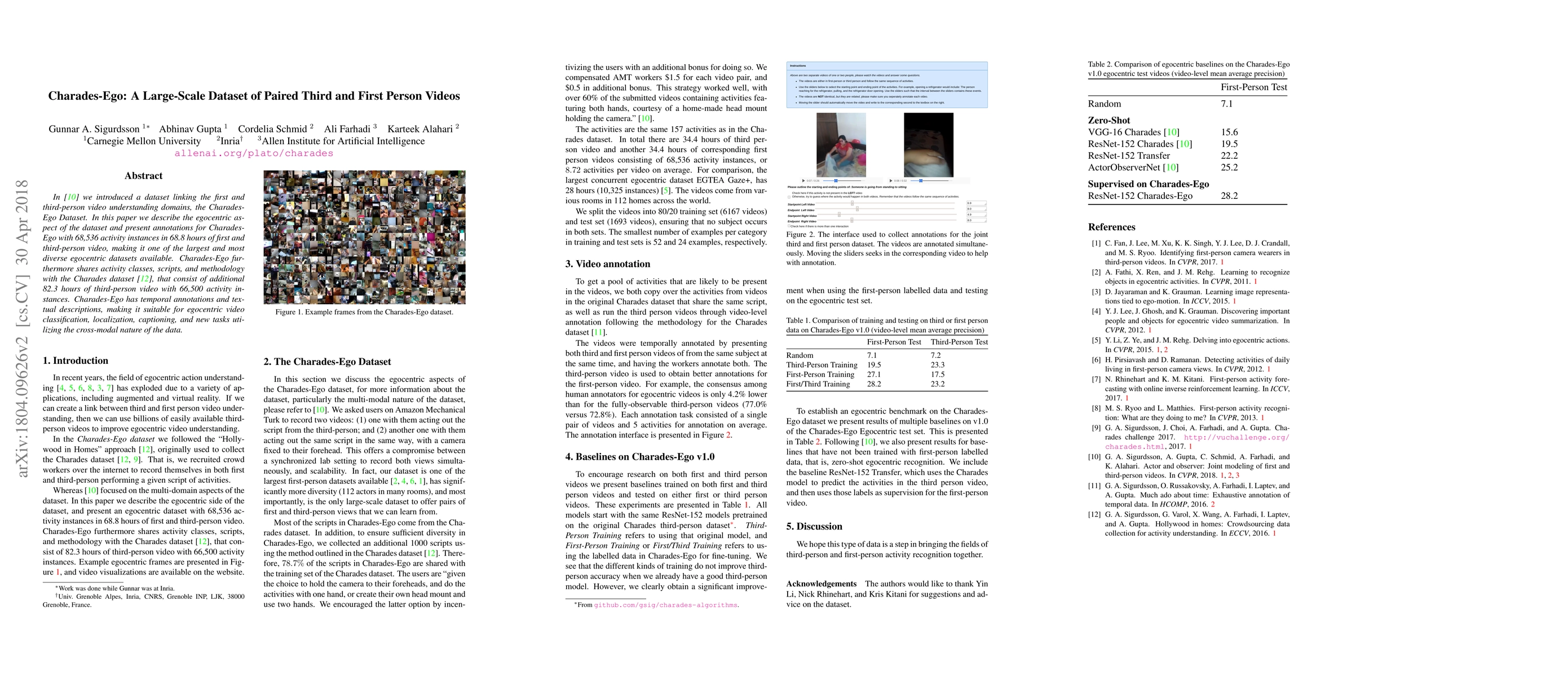 In Actor and Observer we introduced a dataset linking the first and third-person video understanding domains, the Charades-Ego Dataset. In this paper we describe the egocentric aspect of the dataset and present annotations for Charades-Ego with 68,536 activity instances in 68.8 hours of first and third-person video, making it one of the largest and most diverse egocentric datasets available. Charades-Ego furthermore shares activity classes, scripts, and methodology with the Charades dataset, that consist of additional 82.3 hours of third-person video with 66,500 activity instances. Charades-Ego has temporal annotations and textual descriptions, making it suitable for egocentric video classification, localization, captioning, and new tasks utilizing the cross-modal nature of the data.