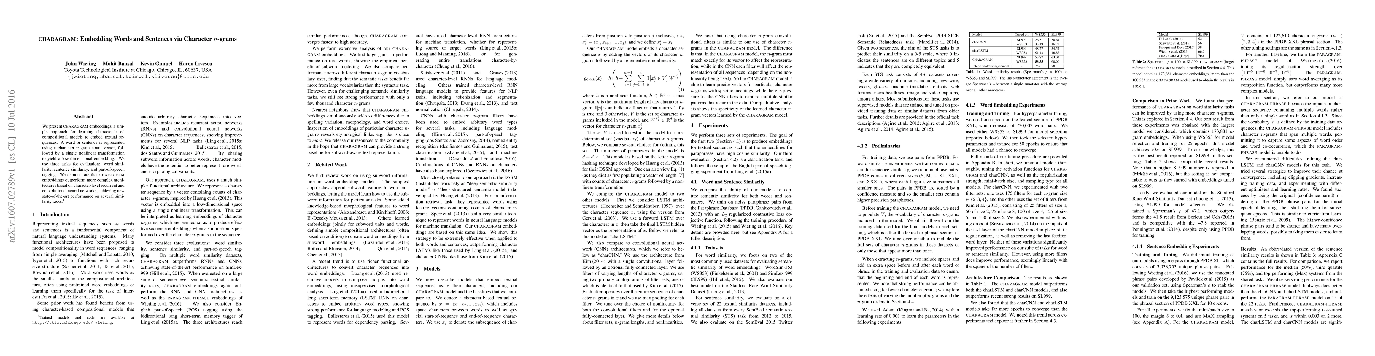 This paper introduces Charagram embeddings, a straightforward method for character-based text representation using n-gram counts and a nonlinear transformation. It outperforms complex character-level models in word similarity, sentence similarity, and part-of-speech tagging tasks, achieving state-of-the-art results in similarity tasks.