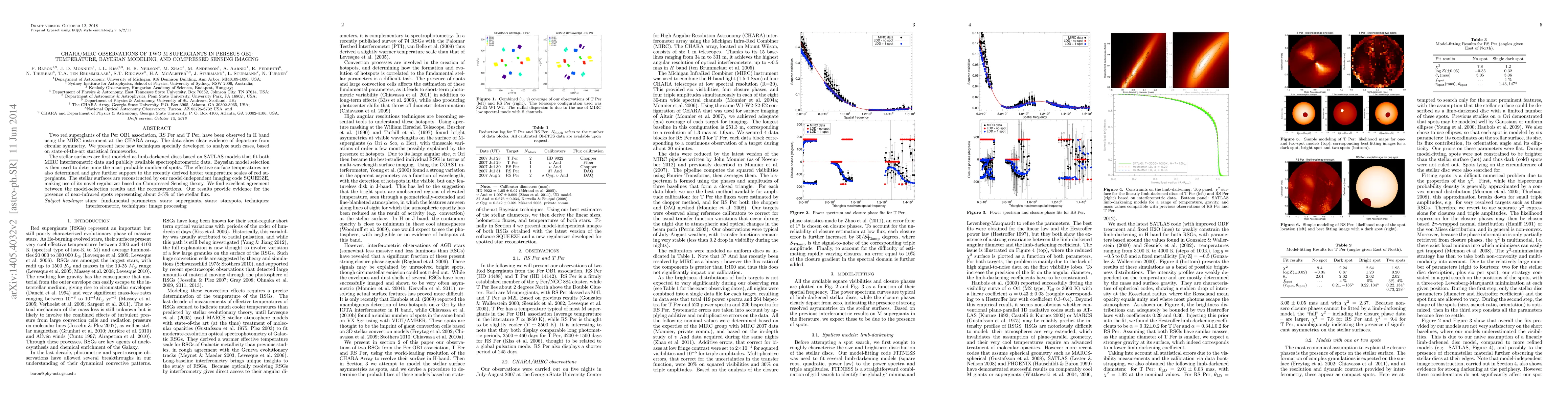 This paper uses CHARA/MIRC observations to analyze two red supergiants in Perseus OB1, revealing asymmetry in their shapes. Advanced Bayesian modeling and Compressed Sensing imaging techniques are employed to reconstruct their surfaces, confirming hotter temperature scales and identifying near-infrared spots contributing to 3-5% of their flux.