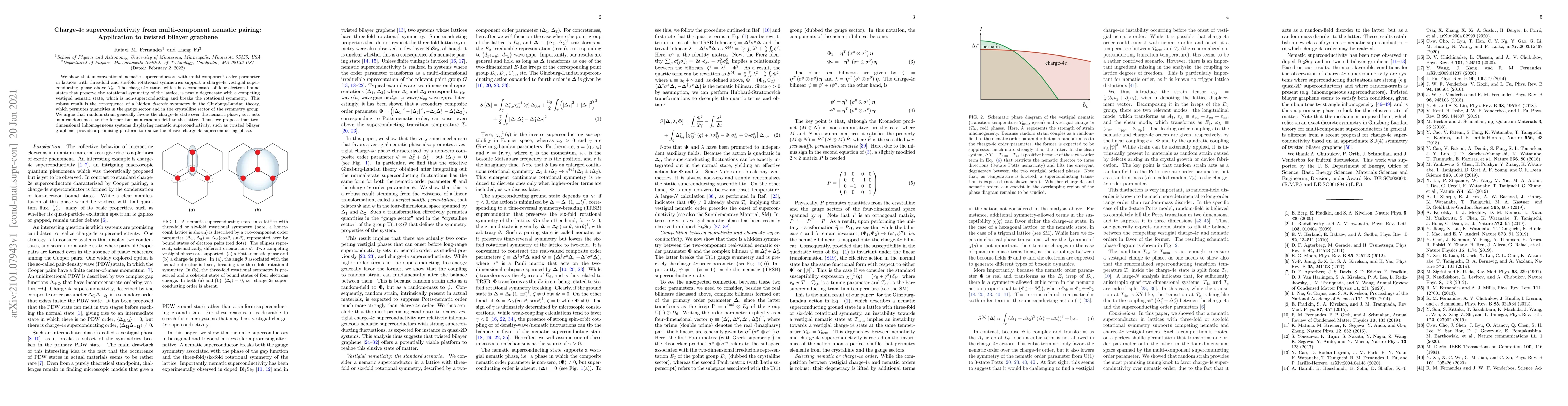 This paper demonstrates that unconventional nematic superconductors with multi-component order parameters can support a charge-$4e$ superconducting phase, which is nearly degenerate with a competing non-superconducting nematic phase. The authors propose that twisted bilayer graphene could be a promising platform to realize this charge-$4e$ state due to the effect of random strain.
