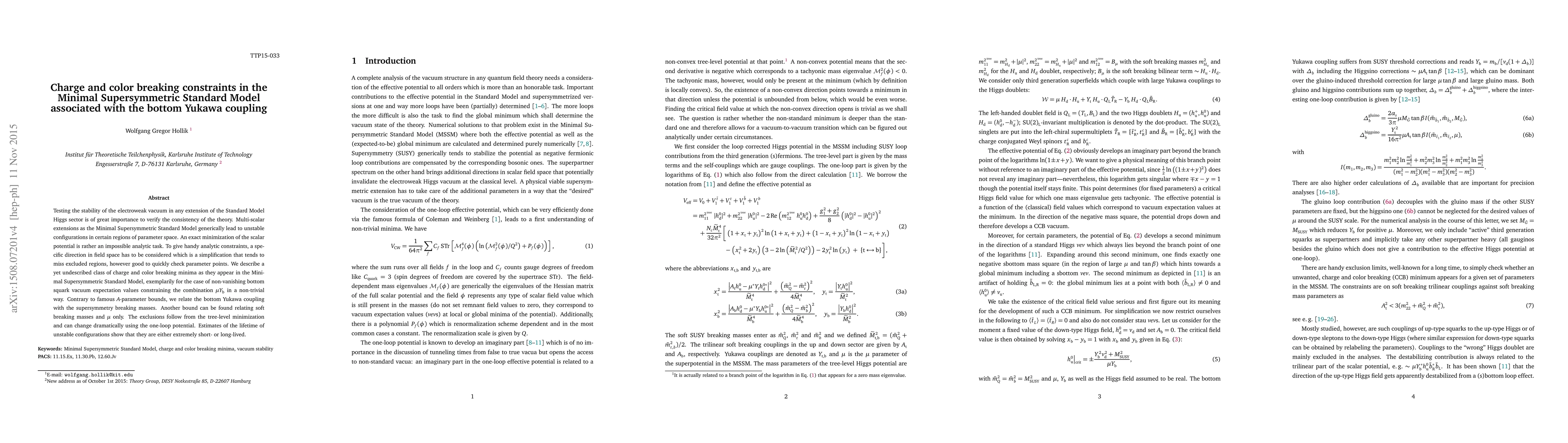 This paper explores charge and color breaking constraints in the Minimal Supersymmetric Standard Model (MSSM) related to the bottom Yukawa coupling, identifying new analytic constraints on the mu and Yb parameters. It finds that while tree-level minimization can lead to unstable configurations, one-loop potential adjustments can drastically alter these constraints.