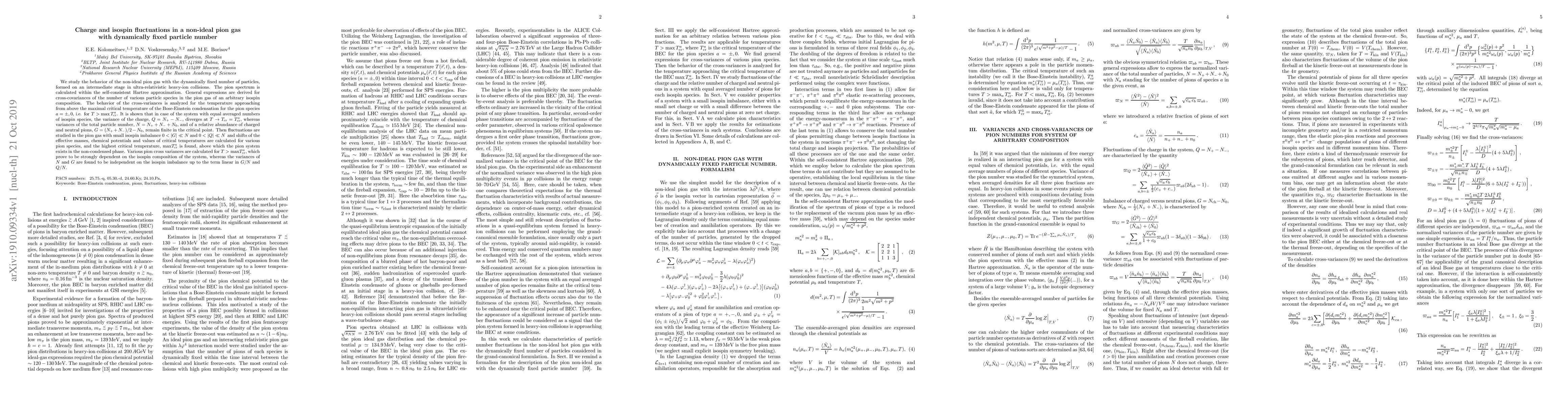 This paper investigates charge and isospin fluctuations in a non-ideal pion gas with dynamically fixed particle number, formed during ultra-relativistic heavy-ion collisions. It derives expressions for cross-covariances of particle species and analyzes variances near the critical temperature for Bose-Einstein condensation, revealing that charge variance diverges while total particle number and relative abundance variances remain finite.