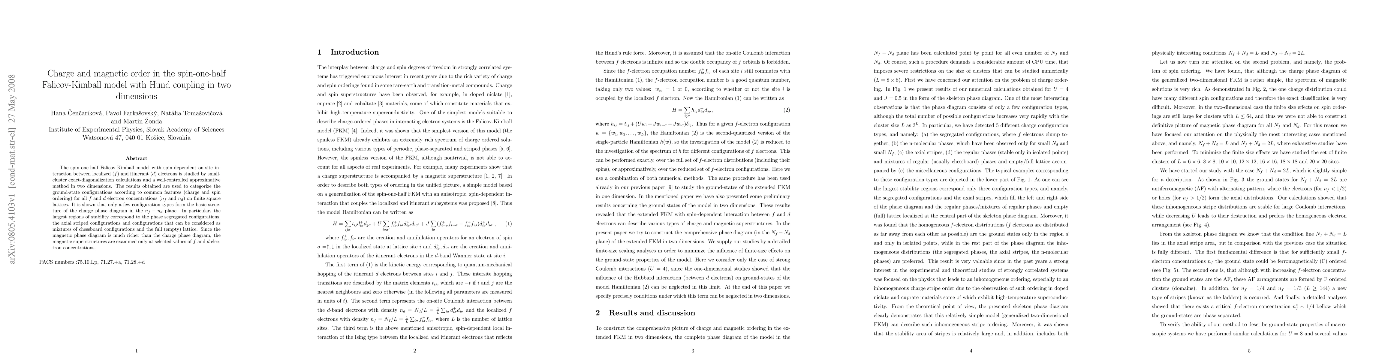 This paper investigates the spin-one-half Falicov-Kimball model with Hund coupling in two dimensions, revealing that the ground state configurations are primarily phase segregated, axial striped, or mixed chessboard/full lattice types. The magnetic phase diagram is more complex and is analyzed at specific electron concentrations.