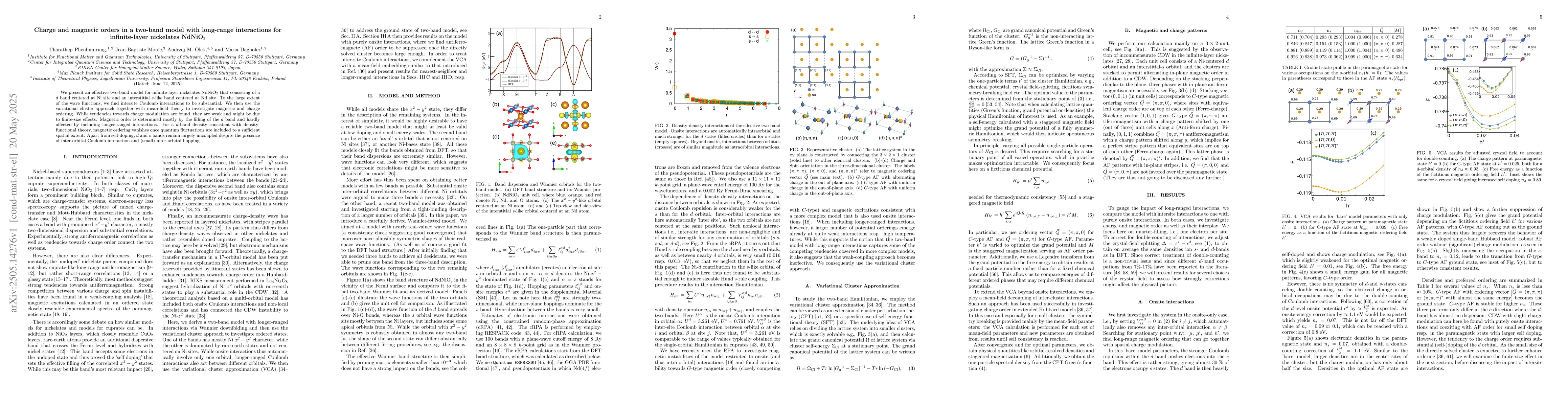 The paper introduces a two-band model incorporating long-range interactions to study charge and magnetic orders in infinite-layer nickelates, utilizing variational cluster approach and mean-field theory.