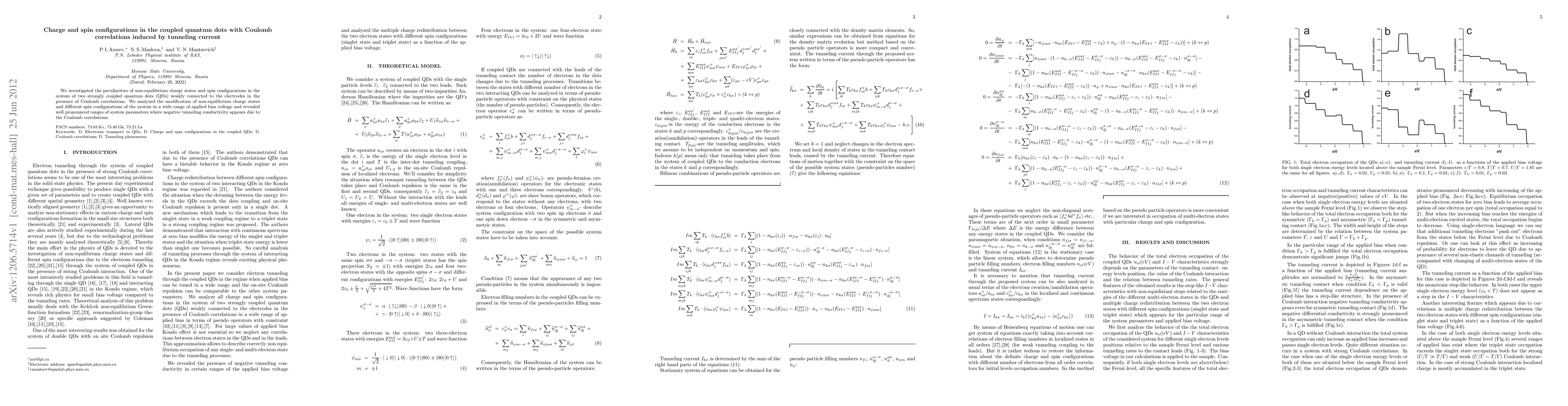 This paper explores the non-equilibrium charge states and spin configurations in a system of two strongly coupled quantum dots under varying bias voltages, highlighting the impact of Coulomb correlations and identifying conditions where negative tunneling conductivity emerges.