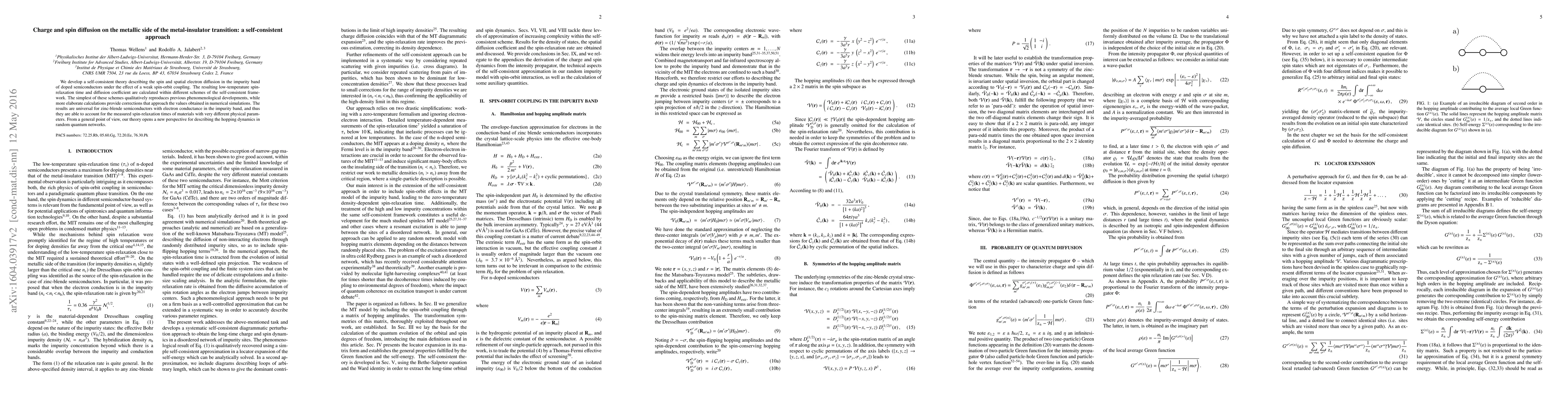 We develop a self-consistent theory describing the spin and spatial electron diffusion in the impurity band of doped semiconductors under the effect of a weak spin-orbit coupling. The resulting low-temperature spin-relaxation time and diffusion coefficient are calculated within different schemes of the self-consistent framework. The simplest of these schemes qualitatively reproduces previous phenomenological developments, while more elaborate calculations provide corrections that approach the values obtained in numerical simulations. The results are universal for zinc-blende semiconductors with electron conductance in the impurity band, and thus they are able to account for the measured spin-relaxation times of materials with very different physical parameters. From a general point of view, our theory opens a new perspective for describing the hopping dynamics in random quantum networks.