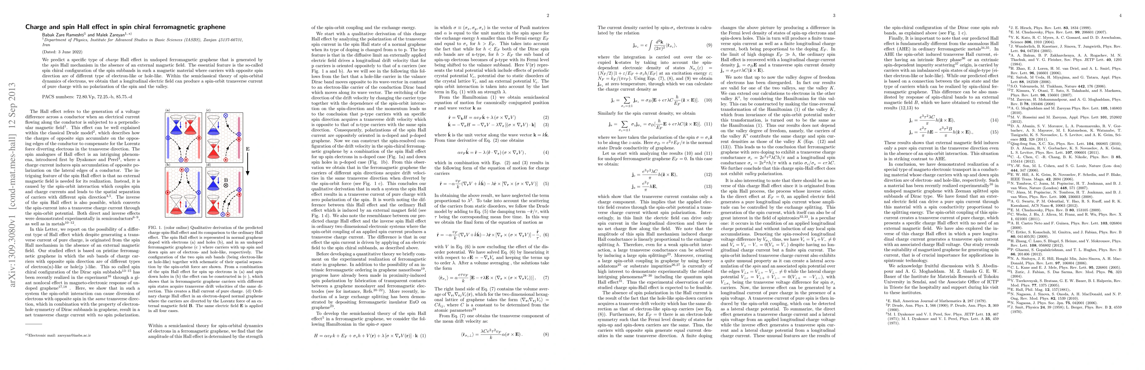 We predict a specific type of charge Hall effect in undoped ferromagnetic graphene that is generated by the spin Hall mechanism in the absence of an external magnetic field. The essential feature is the so-called spin chiral configuration of the spin subbands in such a magnetic material where carriers with opposite spin direction are of different type of electron-like or hole-like. Within the semiclassical theory of spin-orbital dynamics of electrons, we obtain that a longitudinal electric field can produce a spin-orbit transverse current of pure charge with no polarization of the spin and the valley.