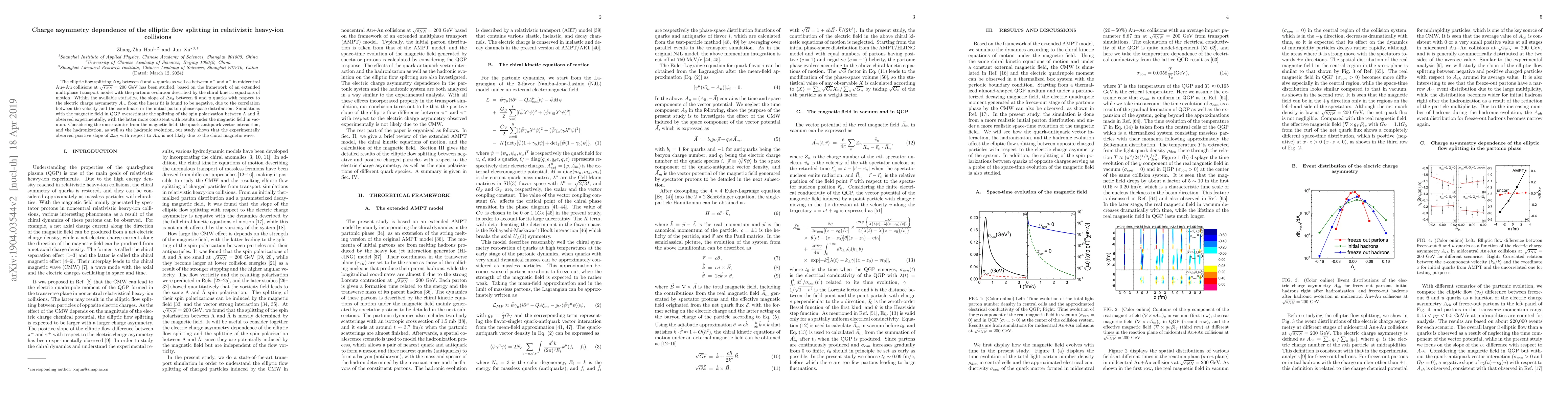 The elliptic flow splitting $\Delta v_2$ between $\bar{u}$ and $u$ quarks as well as between $\pi^-$ and $\pi^+$ in midcentral Au+Au collisions at $\sqrt{s_{NN}}=200$ GeV has been studied, based on the framework of an extended multiphase transport model with the partonic evolution described by the chiral kinetic equations of motion. Within the available statistics, the slope of $\Delta v_2$ between $\bar{u}$ and $u$ quarks with respect to the electric charge asymmetry $A_{ch}$ from the linear fit is found to be negative, due to the correlation between the velocity and the coordinate in the initial parton phase-space distribution. Simulations with the magnetic field in QGP overestimate the splitting of the spin polarization between $\Lambda$ and $\bar{\Lambda}$ observed experimentally, with the latter more consistent with results under the magnetic field in vacuum. Considering the uncertainties from the magnetic field, the quark-antiquark vector interaction, and the hadronization, as well as the hadronic evolution, our study shows that the experimentally observed positive slope of $\Delta v_2$ with respect to $A_{ch}$ is not likely due to the chiral magnetic wave.