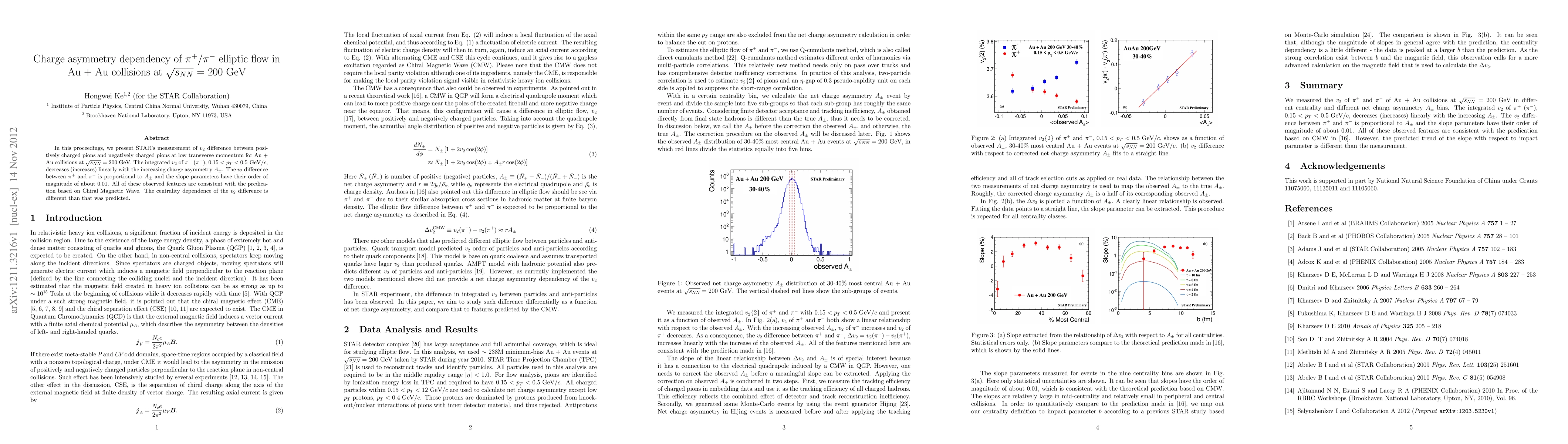 In this proceedings, we present STAR's measurement of $v_{2}$ difference between positively charged pions and negatively charged pions at low transverse momentum for Au + Au collisions at $\sqrt{s_{NN}}$ = 200 GeV. The integrated $v_2$ of $\pi^+$ ($\pi^-$), $0.15 < p_T < 0.5 GeV/c$, decreases (increases) linearly with the increasing charge asymmetry $A_{\pm}$. The $v_2$ difference between $\pi^+$ and $\pi^-$ is proportional to $A_{\pm}$ and the slope parameters have their order of magnitude of about 0.01. All of these observed features are consistent with the predication based on Chiral Magnetic Wave. The centrality dependence of the $v_2$ difference is different than that was predicted.