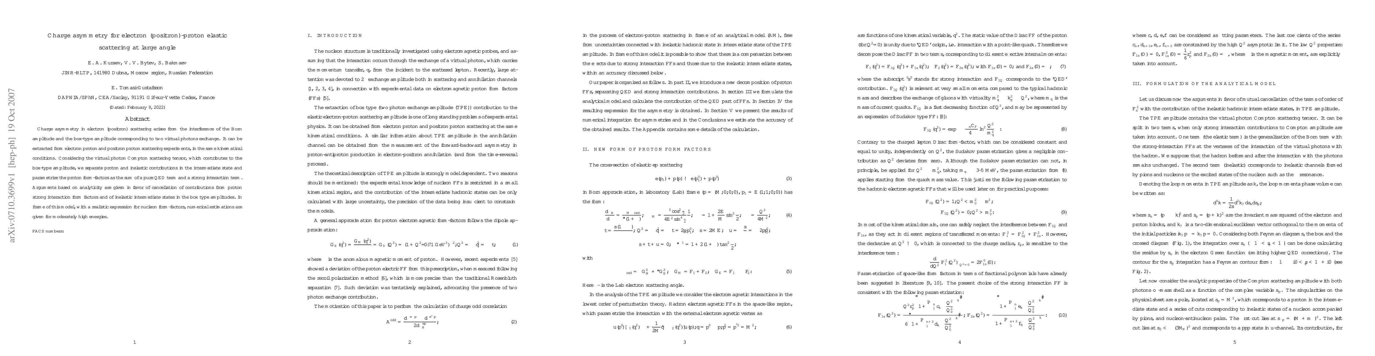 This paper investigates the charge asymmetry in electron-proton and positron-proton elastic scattering at large angles, attributing it to interference effects involving virtual photon exchanges. The study models nucleon form-factors as a combination of QED and strong interaction terms, predicting minimal contributions from strong interaction and inelastic intermediate states, and provides numerical estimates for these effects at moderate high energies.