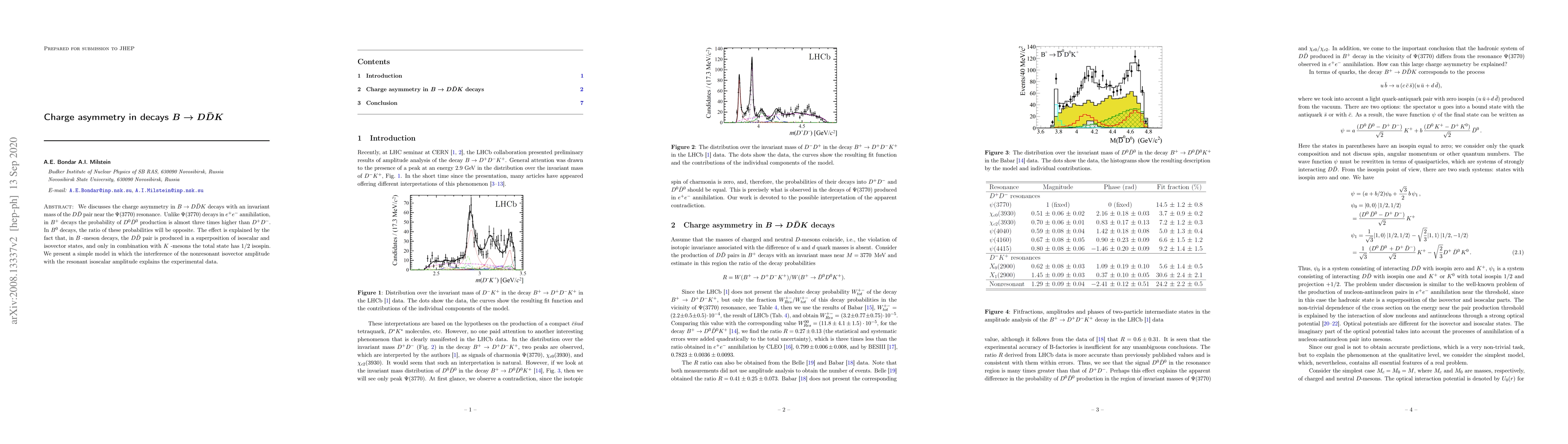 We discusses the charge asymmetry in $ B\rightarrow D\bar DK$ decays with an invariant mass of the $D\bar D$ pair near the $\Psi(3770)$ resonance. Unlike $ \Psi (3770) $ decays in $ e^+e^- $ annihilation, in $B^+$ decays the probability of $D^0\bar D^0$ production is almost three times higher than $D^+ D^-$. In $B^0$ decays, the ratio of these probabilities will be opposite. The effect is explained by the fact that, in $B$ -meson decays, the $D\bar D$ pair is produced in a superposition of isoscalar and isovector states, and only in combination with $K$ -mesons the total state has $ 1/2 $ isospin. We present a simple model in which the interference of the nonresonant isovector amplitude with the resonant isoscalar amplitude explains the experimental data.