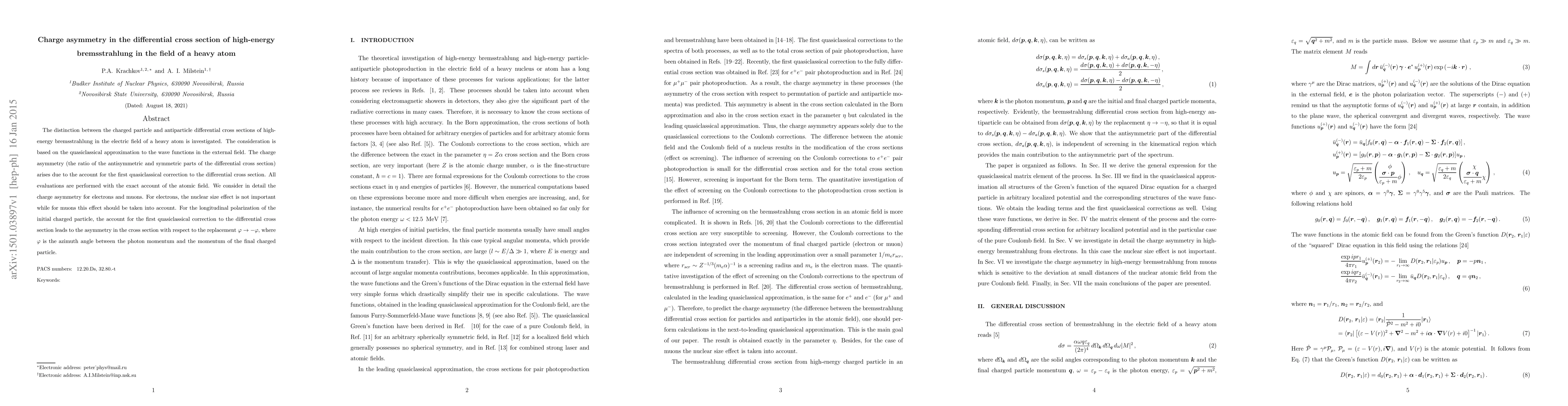 Researchers investigate charge asymmetry in high-energy bremsstrahlung for charged particles like electrons and muons when interacting with a heavy atom's electric field. The study finds that the first quasiclassical correction to the differential cross section leads to an asymmetry in the cross section.