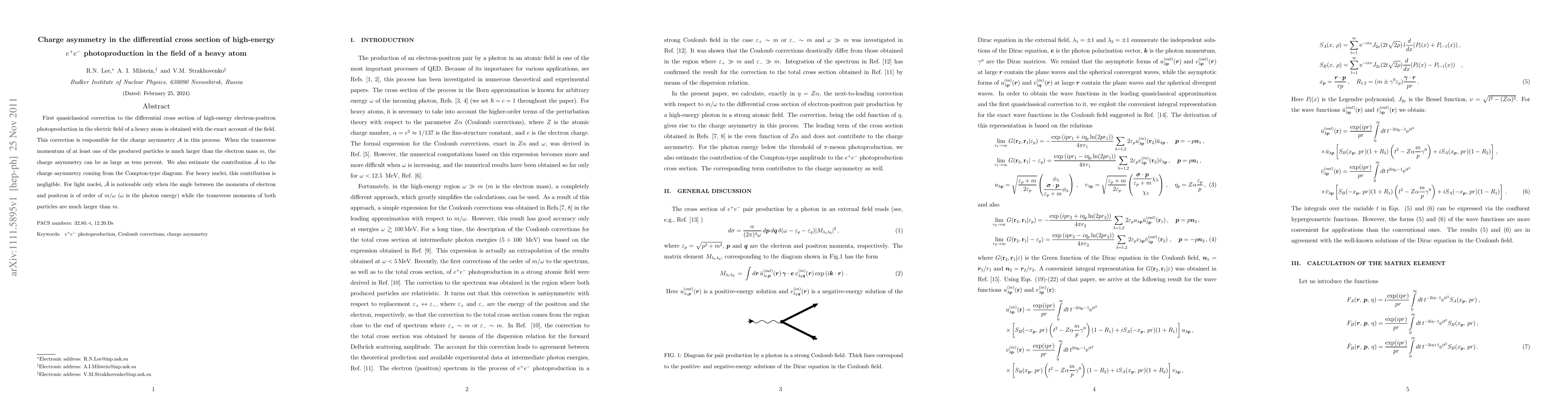 This paper investigates the quasiclassical correction to high-energy e+e- photoproduction in a heavy atom's electric field, revealing a significant charge asymmetry ${\cal A}$ when transverse momentum is much larger than the electron mass. The study also estimates a minor contribution $\tilde{\cal A}$ from Compton-type diagrams, which is negligible for heavy nuclei but noticeable for light nuclei under specific conditions.